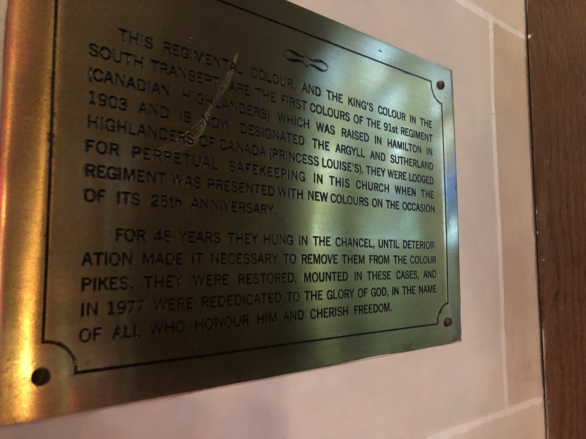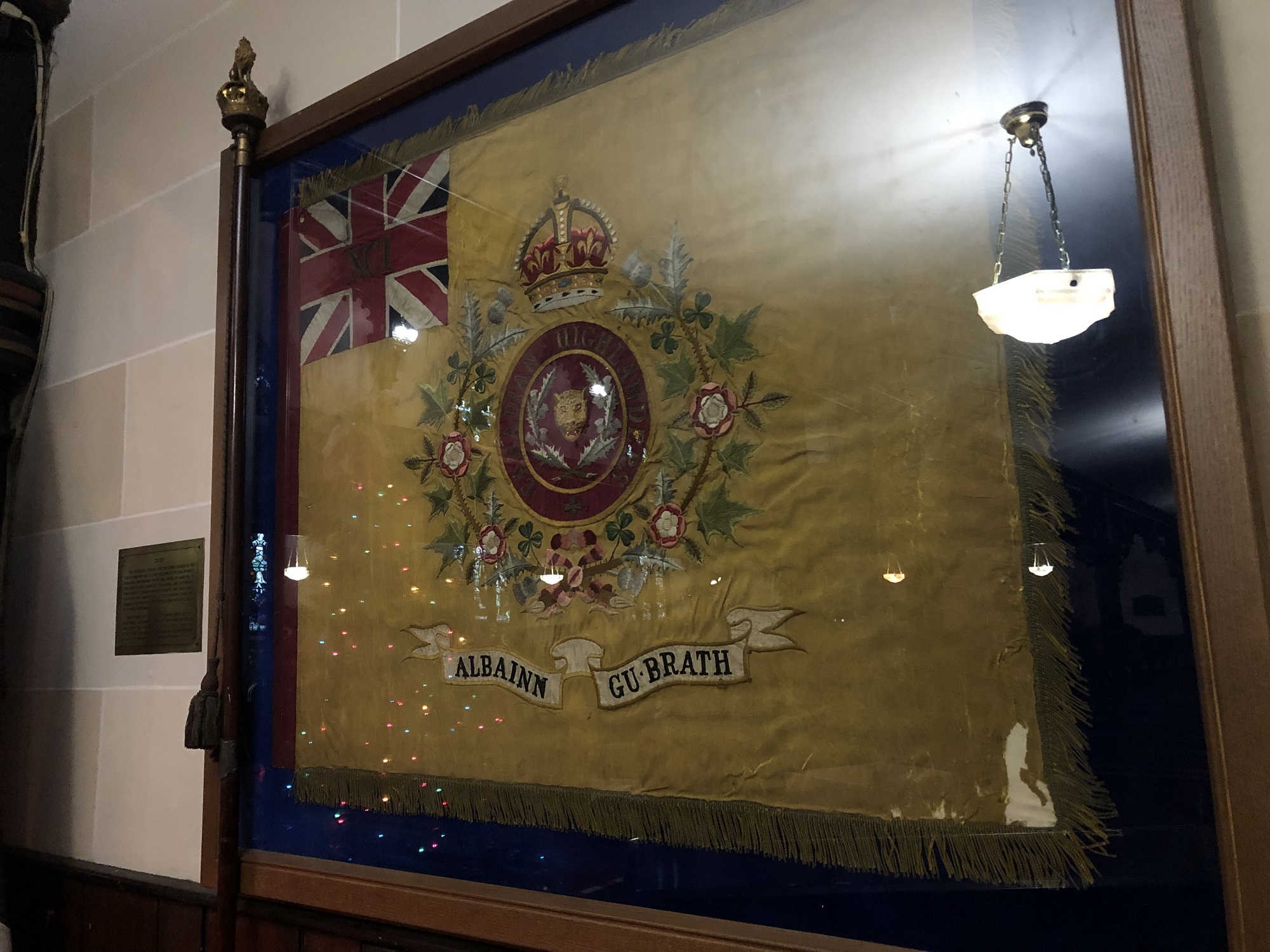 Il s’agit des premières couleurs du 91st Regiment Canadian Highlanders, qui a vu le jour à Hamilton le 1er septembre 1903 et qui porte désormais le nom de The Argyll and Sutherland Highlanders of Canada (Princess Louise’s). En octobre 1928, les drapeaux de ce régiment ont été confiés à l’église presbytérienne St. Paul afin d’y être conservés de façon permanente, lorsque le régiment a reçu de nouveaux drapeaux à l’occasion de son 25e anniversaire.