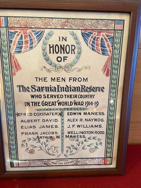Trois tableaux d’honneur situés dans l’église Unie St. Clair rendent hommage aux Premières Nations Aamjiwnaang locales qui ont servi pendant les deux guerres mondiales. Le premier rend hommage à ceux qui ont servi pendant la Première Guerre mondiale et les deux autres (dont l’un a été achevé avant la fin de la guerre) à ceux qui ont servi pendant la Seconde Guerre mondiale.