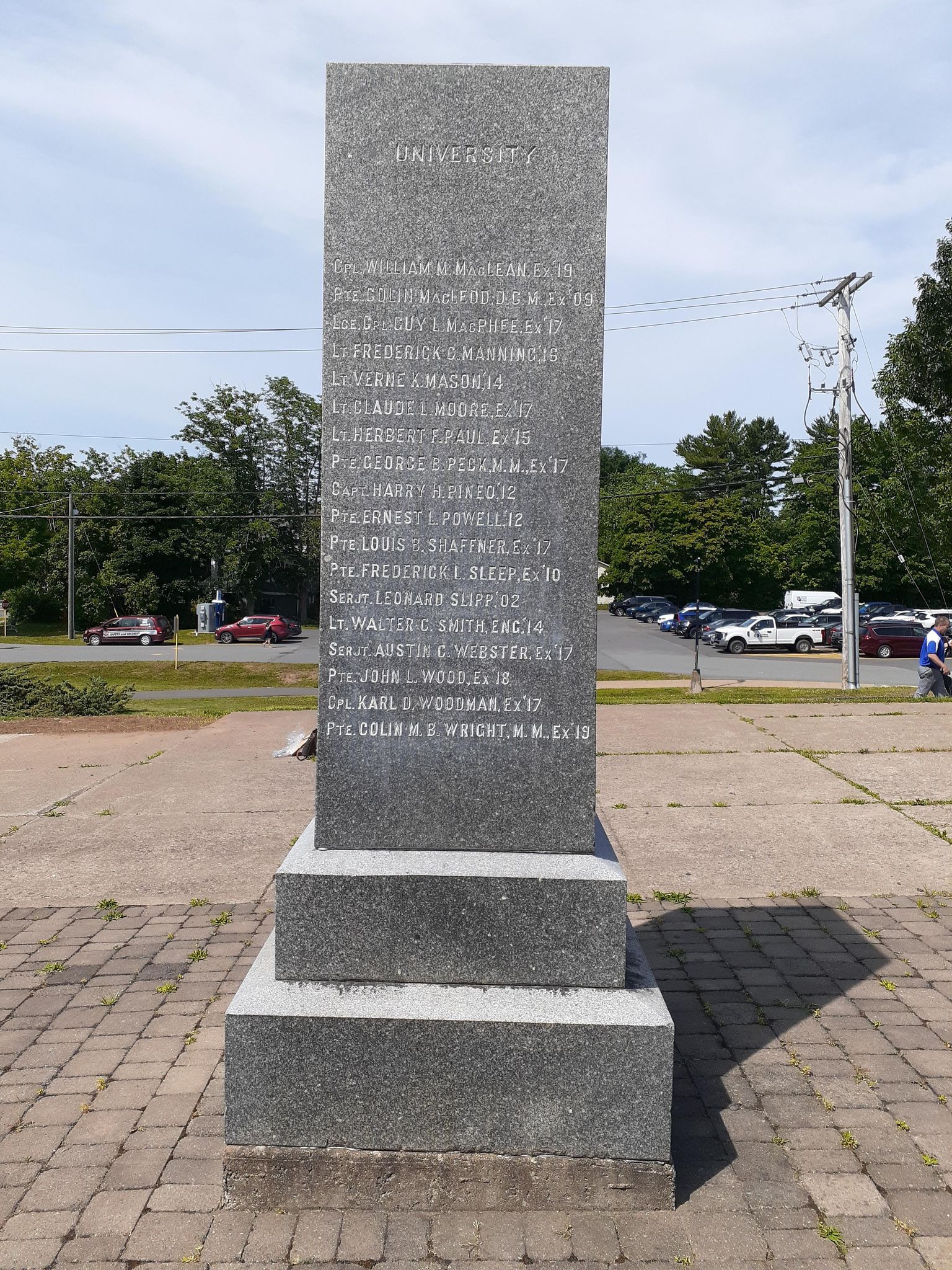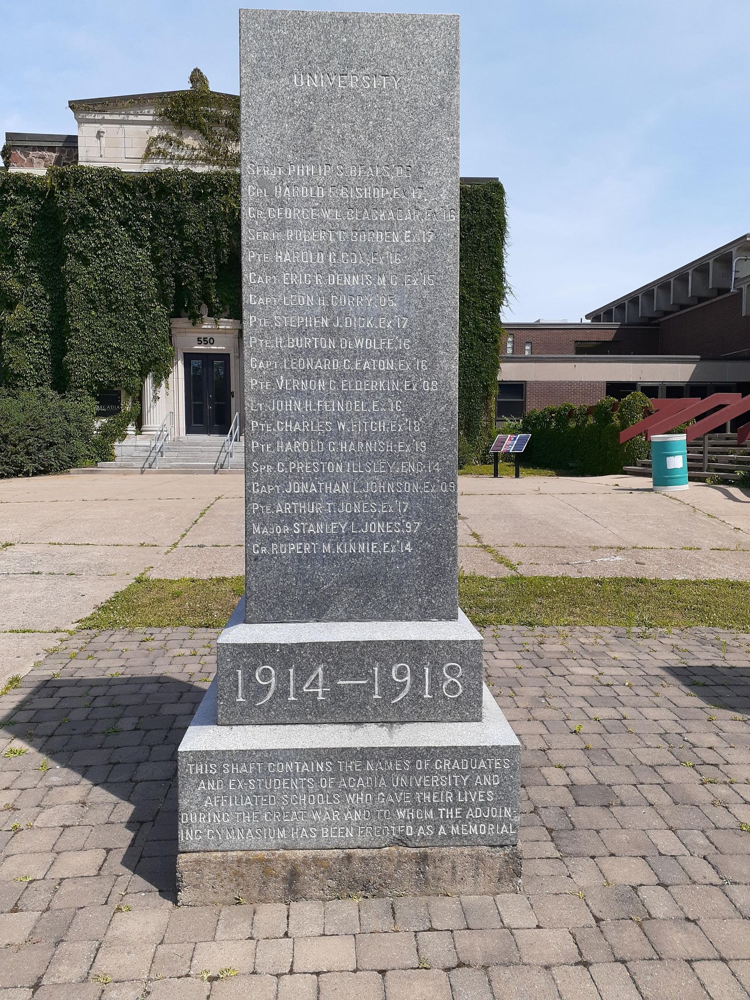 Ce mémorial, intégré au complexe commémoratif du gymnase, est dédié aux universitaires qui sont morts au combat durant la Première Guerre mondiale. L’article ci-dessous est tiré du Chronicle Herald (Nouvelle-Écosse) du dimanche 14 août 2005. Hommage aux anciens d’Acadia morts à la guerre Des diplômés universitaires sacrifient leur vie Par Anthony Cooper WOLFVILLE – Pour souligner l’Année de l’ancien combattant et le 60e anniversaire de la fin de la Seconde Guerre mondiale, un monument a été dévoilé à l’Université Acadia samedi pour accompagner celui qui s’y dresse déjà en hommage aux morts de la Première Guerre mondiale. C’est la concrétisation d’un rêve de longue date du regretté Robbins Elliot, diplômé de 1941 qui a servi dans les North Nova Scotia Highlanders. Celui-ci souhaitait voir ériger un monument à la mémoire des anciens étudiants d’Acadia qui sont morts au combat lors de la Seconde Guerre mondiale et de la guerre de Corée. À son décès en novembre 2003, à 83 ans, M. Elliot travaillait à la création du monument. Selon Ashley Spearing des affaires des anciens étudiants et organisatrice de l’inauguration, la fille de M. Elliot, Wendy, a pris la relève de son père et a communiqué avec l’Université Acadia au sujet du monument. M. Elliot, qui a été blessé par un tir ami au cours de son entraînement militaire, a servi à l’étranger au cours de la Seconde Guerre mondiale à titre de censeur de la presse. « Il avait vraiment à cœur de rendre hommage à ceux qui ont donné leur vie », a déclaré Wendy Elliot samedi. Selon elle, M. Elliot s’est consacré à la mise en place de plusieurs monuments commémoratifs locaux et a même écrit un livre sur les soldats de la région est du comté de Kings qui ont été tués au cours des deux guerres mondiales. Il avait discuté avec des représentants de l’université et un architecte pour que le monument commémoratif soit érigé. « C’est celui qu’il n’a pas pu finir », a affirmé sa fille, qui tenait au cours de la cérémonie d’inauguration de samedi une photographie de son père. « Notre famille était tout simplement aux anges lorsqu’elle a appris que l’Université Acadia acceptait le projet. » Thomas (Ellie) Irvine, diplômé de 1949 et ancien combattant de la Seconde Guerre mondiale, a procédé à l’inauguration officielle du monument en compagnie de Mme Elliot. « Je vois le nom d’un très bon ami (gravé dans la pierre) – Everett Cameron », a déclaré M. Irvine. « On n’a jamais retrouvé son corps et sa mère a refusé d’accepter sa mort. Ce monument lui rend hommage ainsi qu’à tous les militaires qui sont morts. »