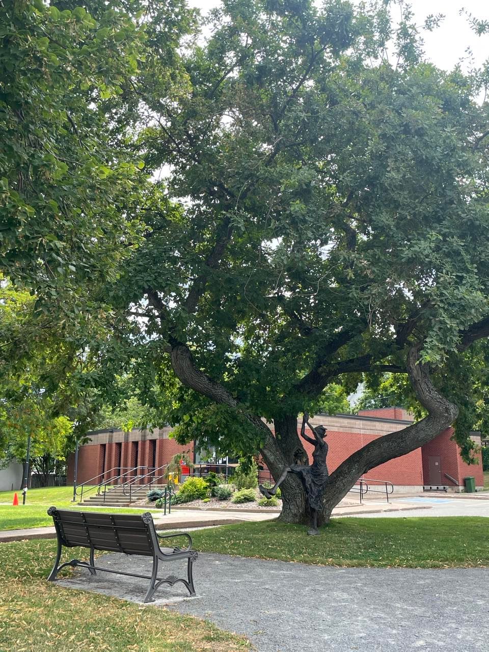 An oak tree with a fascinating history stands behind the Mona Parsons' sculpture, The Joy is Almost Too Much to Bear.