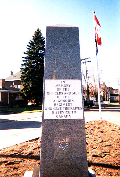 Le monument commémoratif dédié à l’Algonquin Regiment a été dévoilé le 31 août 1961. Il a été érigé à la mémoire des membres de tous grades de l’Algonguin Regiment qui ont fait le sacrifice de leur vie au cours des Première et Seconde Guerres mondiales. Il a été inauguré par le major Cecil Hewitt.