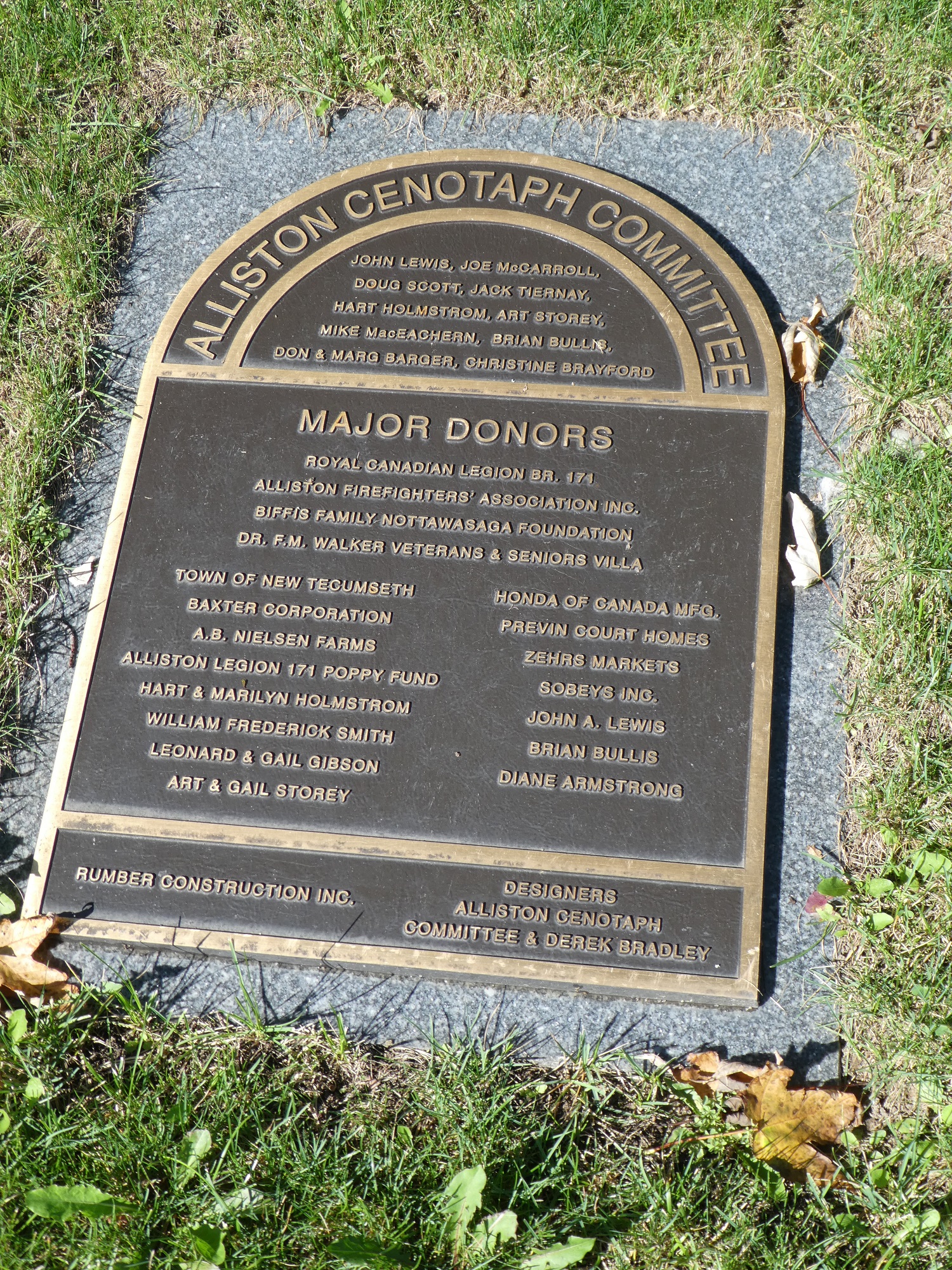 En 2008, un comité a été créé pour construire un cénotaphe en l’honneur des vétérans de la région. Le choix du coin de l’avenue Albert et de l’avenue Paris s’explique par le fait qu’il est adjacent à l’Alliston Memorial Arena, qui a été nommé en l’honneur des vétérans de la région en 1950, et par le fait qu’il est au centre de la ville. Le territoire appartient aux Wendats, aux Haudenosaunees et aux Chippewas/Ojibwés.