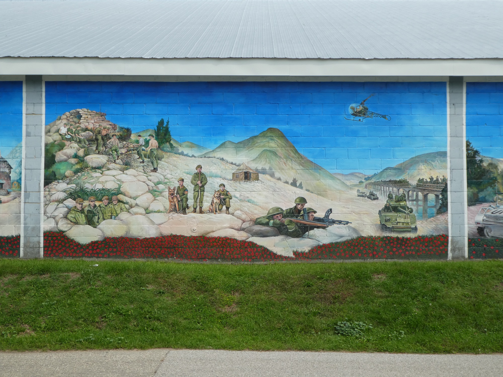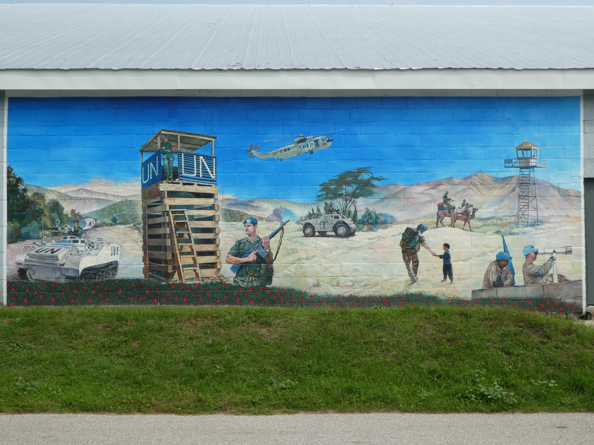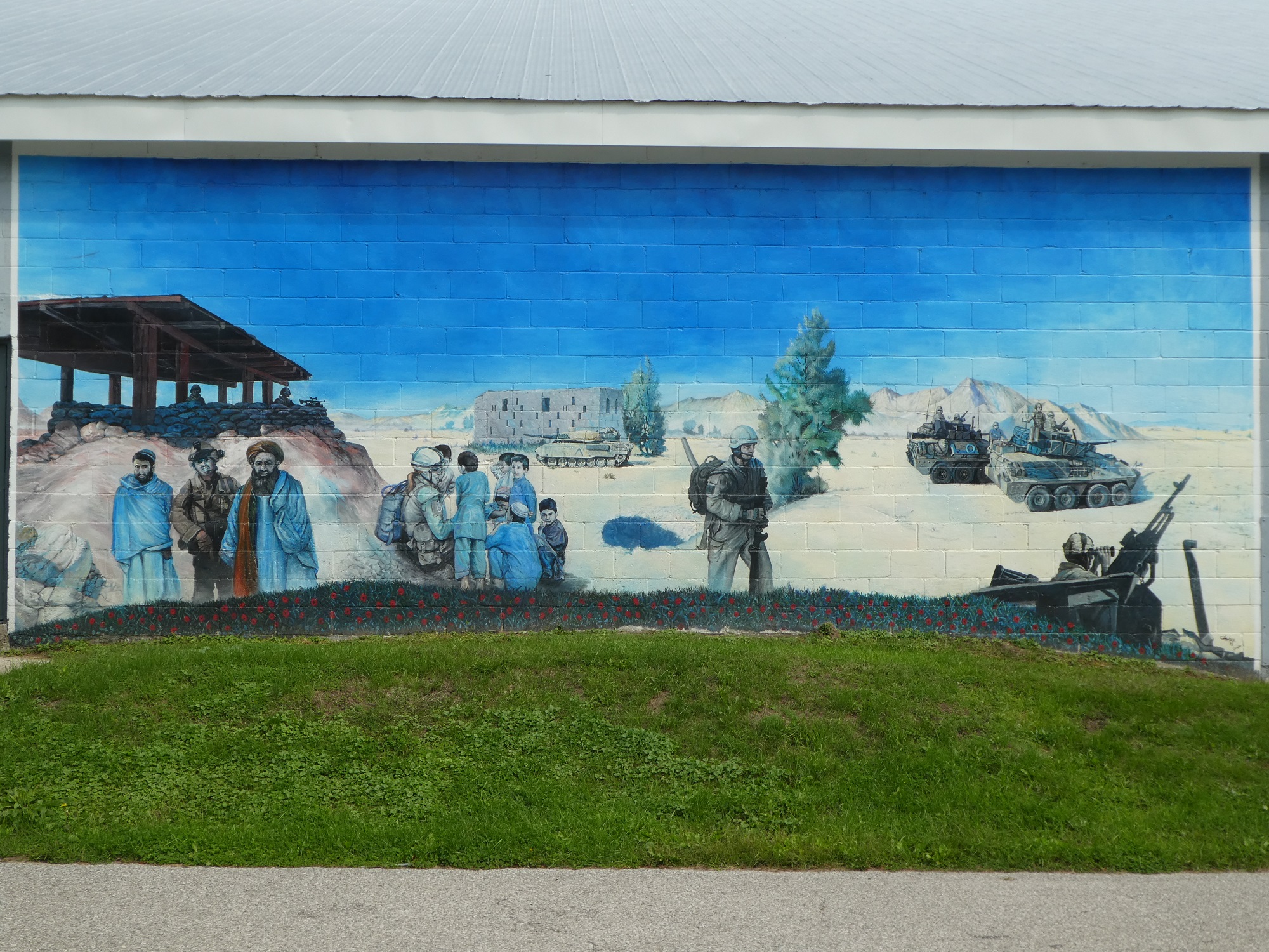 Greg et Sue Hindle ont commencé à travailler à la fresque de guerre d’Alliston en 2015. Ils ont peint des images commémorant la contribution des Canadiens aux missions de maintien de la paix, à la guerre en Afghanistan et à la guerre de Corée. La fresque illustre des soldats des Nations Unies, une tour d’observation, un hélicoptère et un véhicule blindé léger.