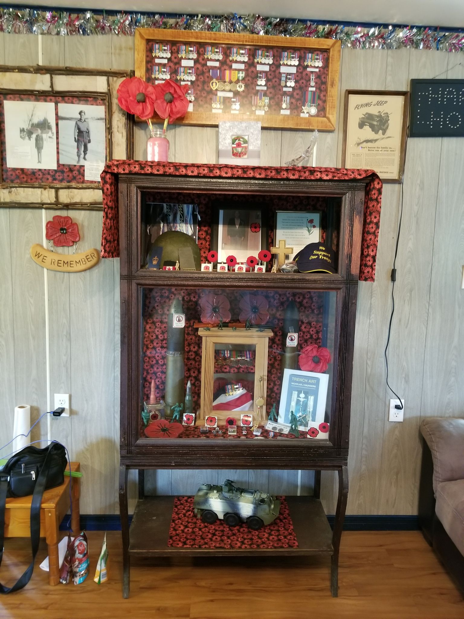 Victor King a transformé une vieille fenêtre de sous-sol en une vitrine de présentoir qui contient toutes les médailles des vétérans de la Première Nation Aundeck Omni Kaning. Avec l’aide du sergent Wayne Golden, les médailles de tous les vétérans ont été placées dans la vitrine. Alicia McGraw a confectionné onze chemises à rubans coquelicot pour l’occasion et Connie Esquimaux a tricoté des coquelicots.