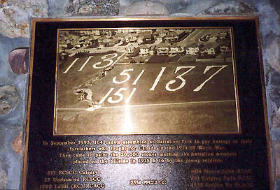 In September 1995, 104 cadets assembled at Battalion Park to pay homage to their forefathers who fought for Canada in the 1914-18 World War. They came to paint the 20,000 stones marking the battalion numbers placed on the hillside in 1915 & 16 by the young soldiers.