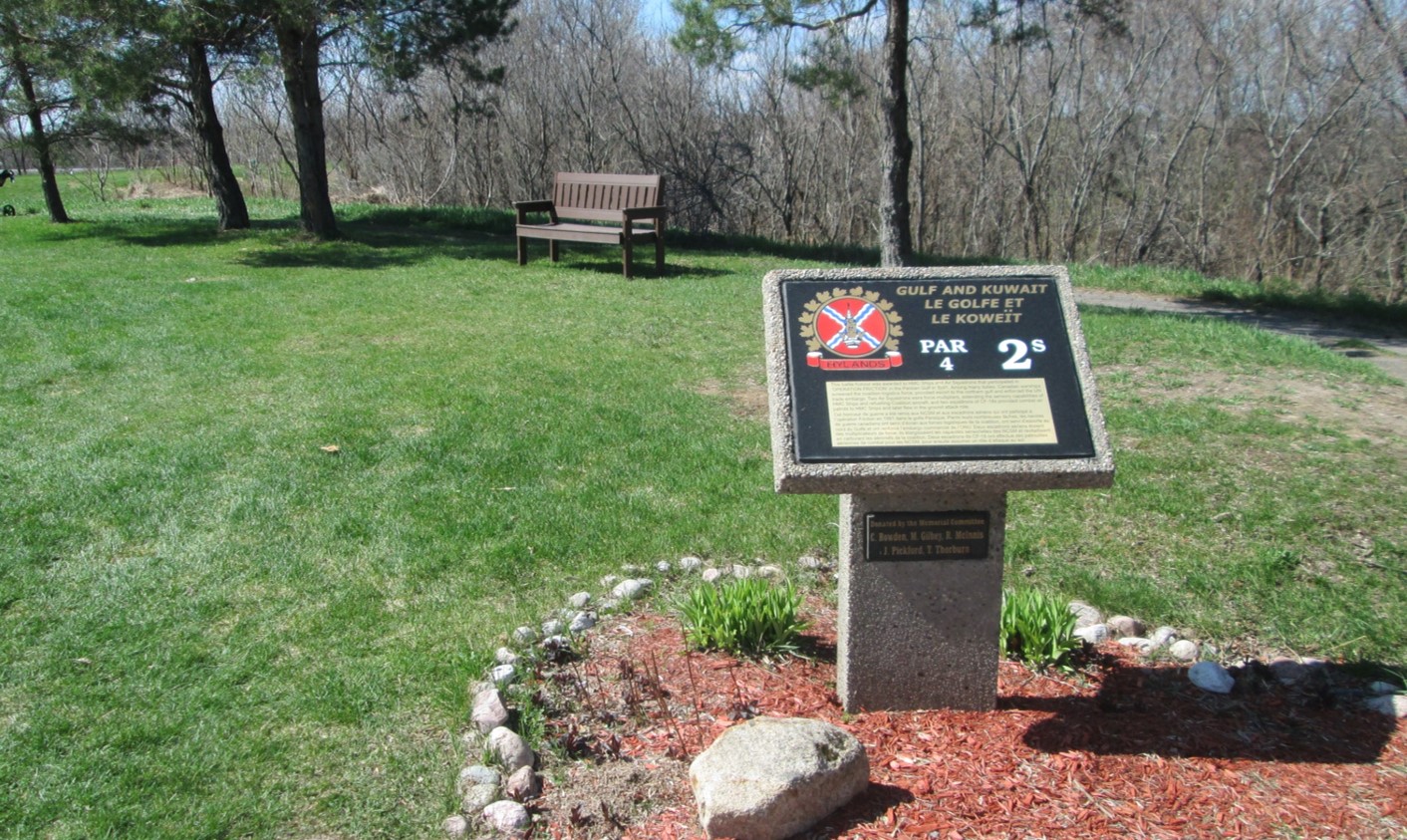 Cette plaque commémorative honore la participation canadienne à la guerre du Golfe et les navires et escadrons canadiens qui se sont vus décerner l'honneur du Golfe et du Koweït.