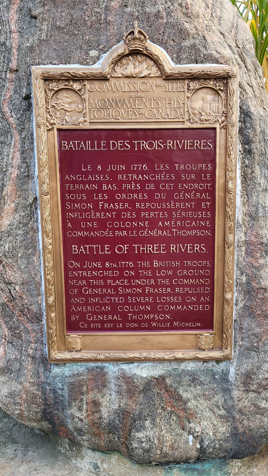 Ce monument a été érigé à la mémoire des soldats anglais et canadiens qui ont combattu à cet endroit une colonne américaine, lors de la bataille de Trois-Rivières, dans le contexte de la révolution américaine. Cette bataille eut lieu quelques années après la Confédération et les Américains furent vaincus. Les Anglais et les Canadiens étaient sous le commandement du général Simon Fraser, et les Américains étaient commandés par le général Thompson. Le 8 juin 1776, les troupes anglaises, retranchées sur les terres basses près de cet endroit sous les ordres du général Simon Fraser, repoussèrent une colonne américaine commandée par le général Thompson et lui infligèrent des pertes sérieuses.