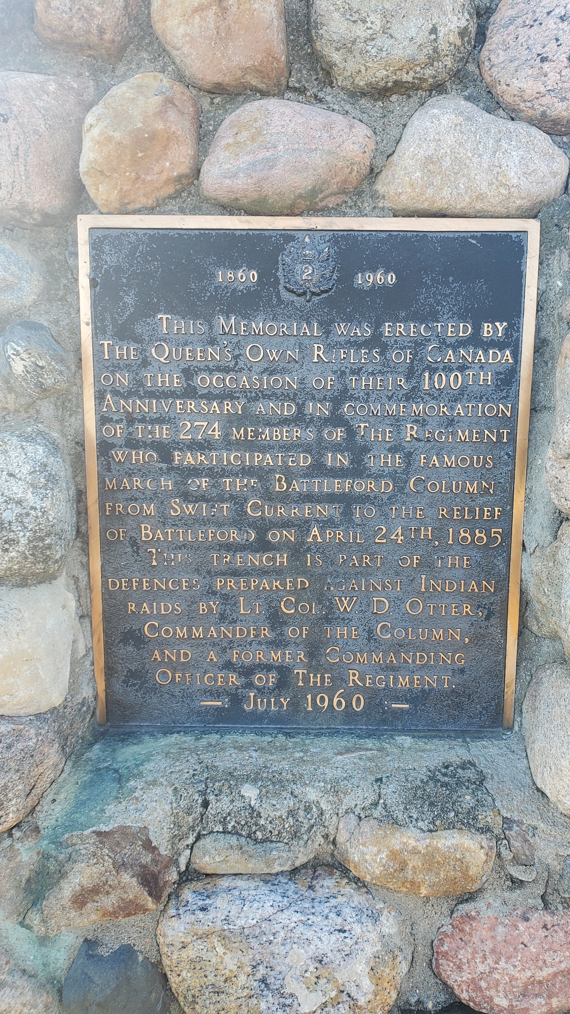Ce monument a été érigé en 1960 par le Queen’s Own Rifles of Canada en commémoration des 274 membres du régiment qui ont participé à la célèbre marche de la colonne Battleford de Swift Current pour prendre la relève de Battleford le 24 avril 1885. La tranchée derrière le monument fait partie des défenses préparées contre les raids autochtones par le lieutenant-colonel W. D. Otter, commandant de la colonne et ancien commandant du régiment.