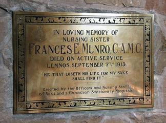 Une plaque de laiton, posée à l’école Bishop Strachan, à Toronto, rend hommage à Frances E. Monro, première infirmière canadienne à mourir au cours de la Grande Guerre.
