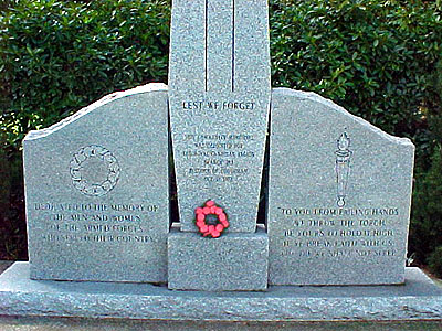 Ce cénotaphe, situé dans le parc Blue Mountain, a été dévoilé le 21 octobre 1972 en hommage aux Canadiens et Canadiennes qui ont servi leur pays dans les Forces armées.