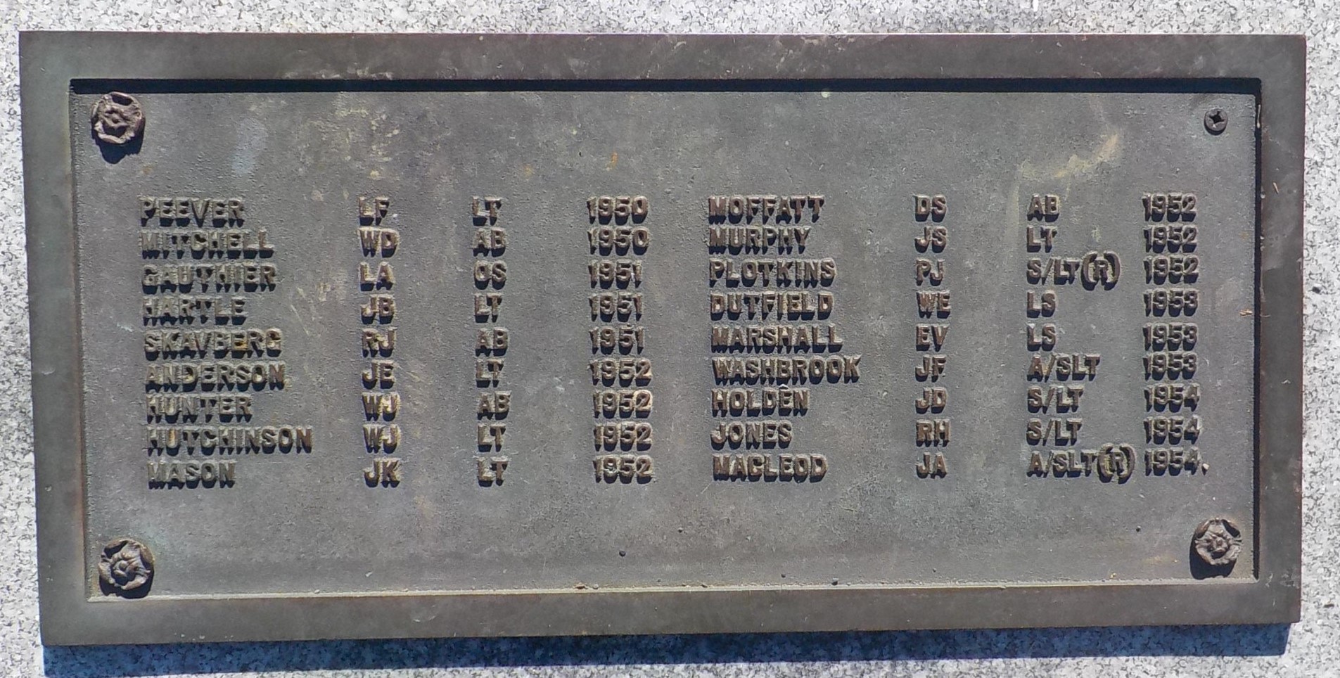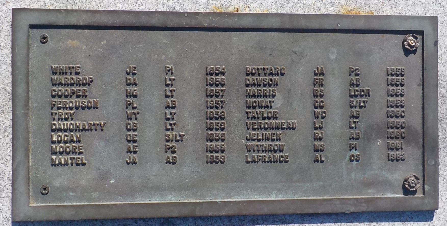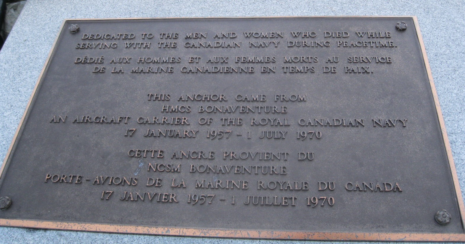 Le monument porte le nom de 131 personnes, la première décédée en 1948 et la dernière en 1994. Parmi eux figurent les noms de neuf membres du NCSM Kootenay qui ont péri lors d’une explosion à bord du navire en 1969 au cours d’exercices navals à 210 milles à l’ouest de Plymouth, en Angleterre. Le monument de l’ancre du NCSM Bonaventure avait grand besoin d’attention depuis de nombreuses années. Le 1er mai 2017, une campagne d’action a été lancée par Allan « Dinger » Bell, un survivant du NCSM Kootenay de 1969, avec le soutien de vétérans et d’organisations de soutien militaire. Les trois ordres de gouvernement et les trois armées (Marine, Forces armées et Forces aériennes) se sont engagés à sécuriser, à réparer et à mettre à jour le monument commémoratif. Ce travail a été achevé en 2019, avec l’ajout de 46 noms. Une nouvelle dédicace du monument de l’ancre du NCSM Bonaventure a eu lieu lors de la cérémonie commémorative du 50e anniversaire du NCSM Kootenay, le 23 octobre 2019.