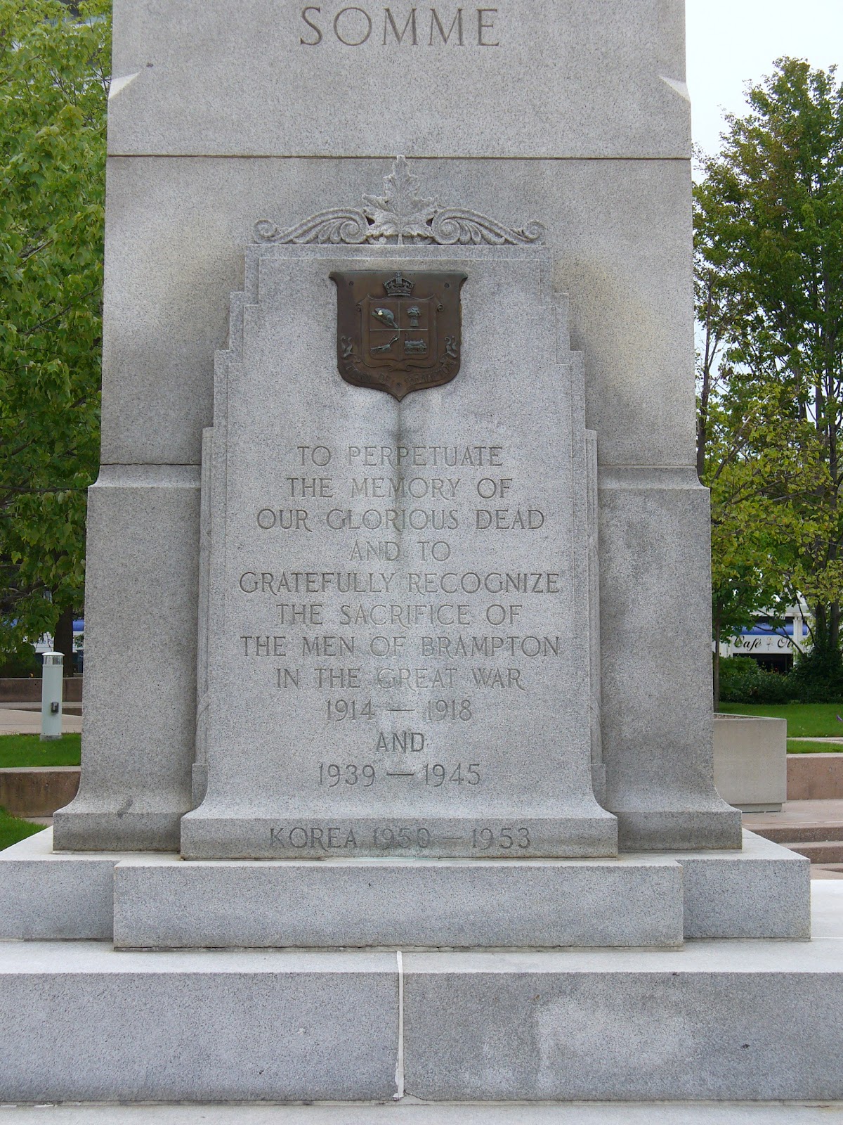 Ce monument symbolise le Service, le Sacrifice et la Victoire. L’ornementation est de style romain. Au-dessus d’une base vaste et ample sur laquelle s’élèvent quelques marches larges et faciles à gravir, les pierres de fondation soutiennent une plaque en saillie. Cette plaque est surmontée d’une plaque de bronze portant l’écusson de la Ville de Brampton et, au-dessus, d’une feuille d’érable – l’emblème national – sculptée en relief parfait et entourée de gracieuses banderoles. Derrière la plaque de bronze se trouve une crypte dans laquelle a été placé un cahier où sont inscrits les noms et les états de service de ceux qui ont fait le sacrifice ultime, ainsi qu’une couronne de la Victoire dont s’échappent des rubans.