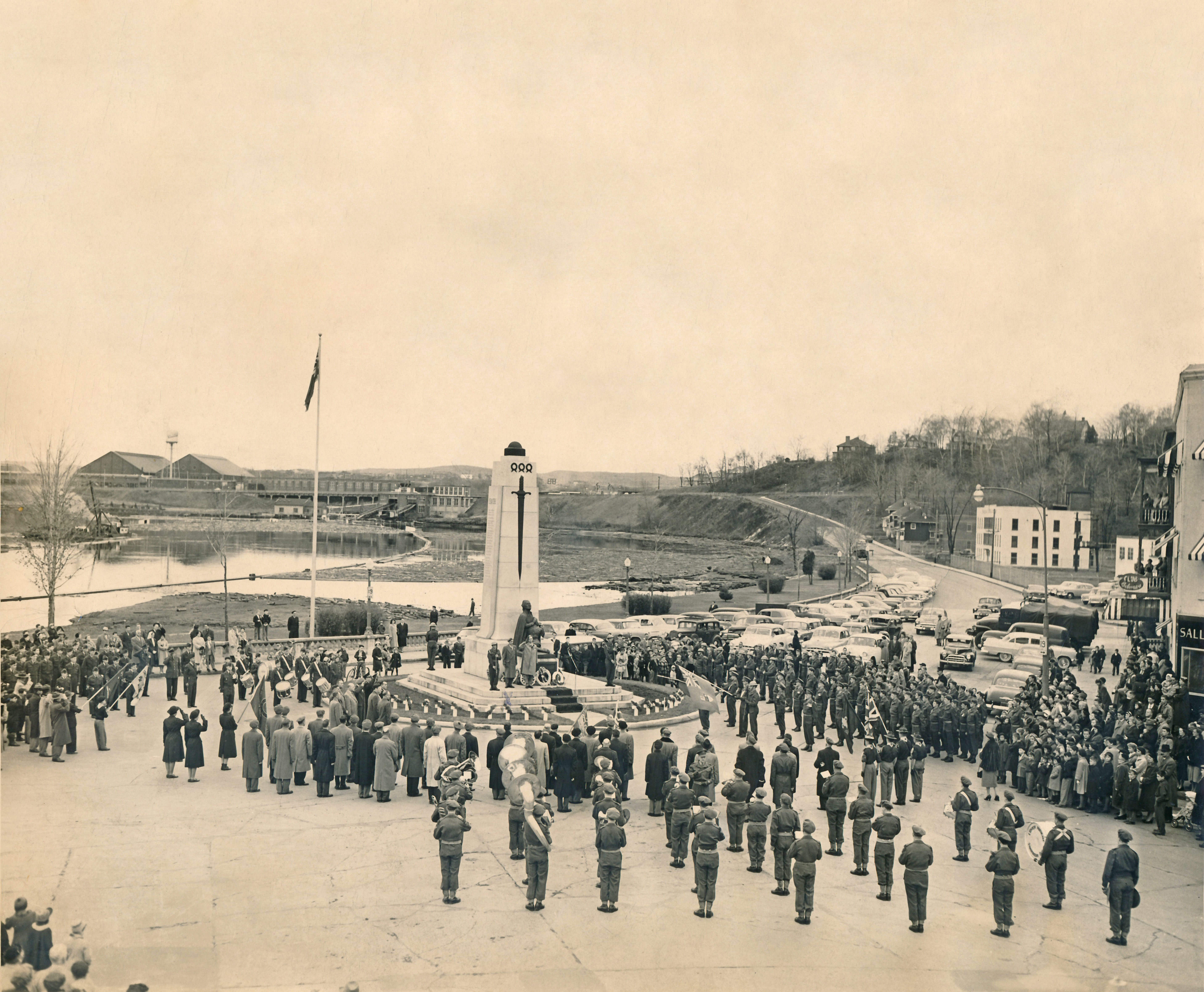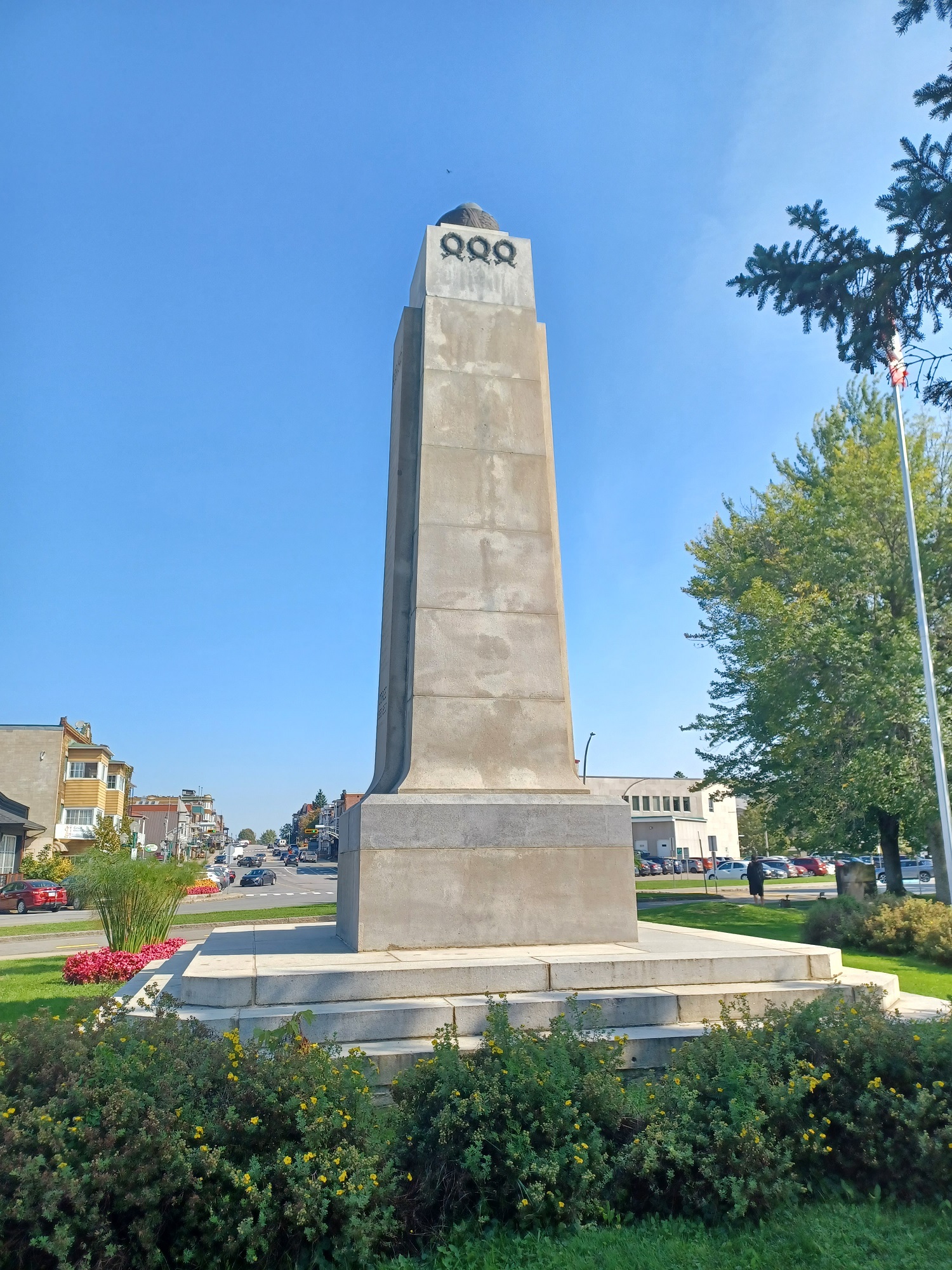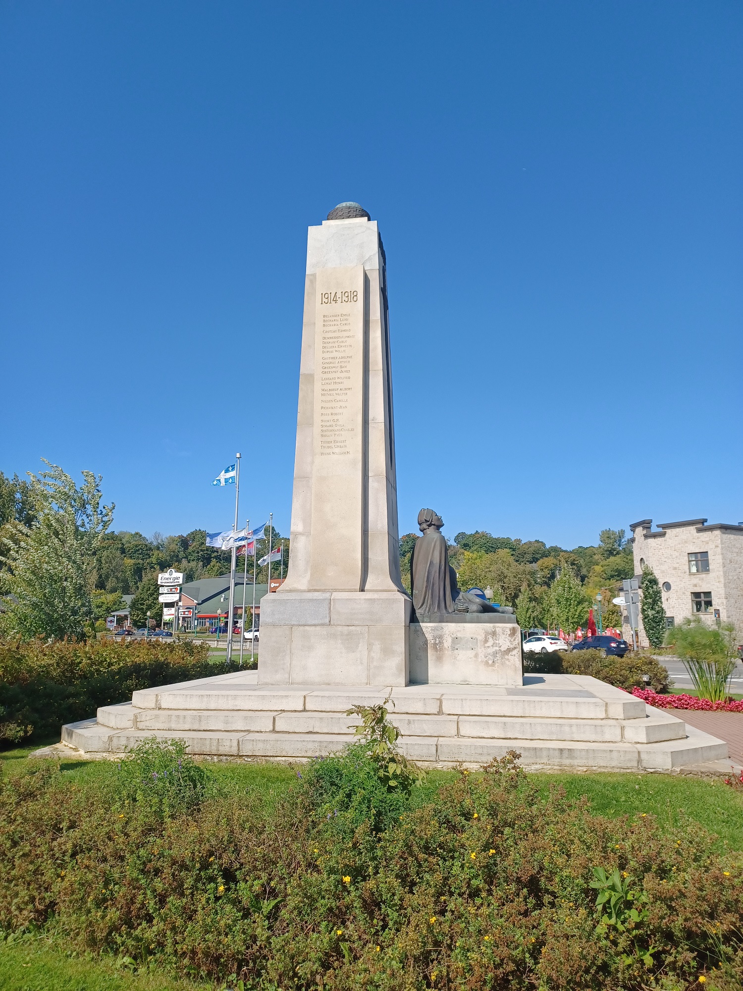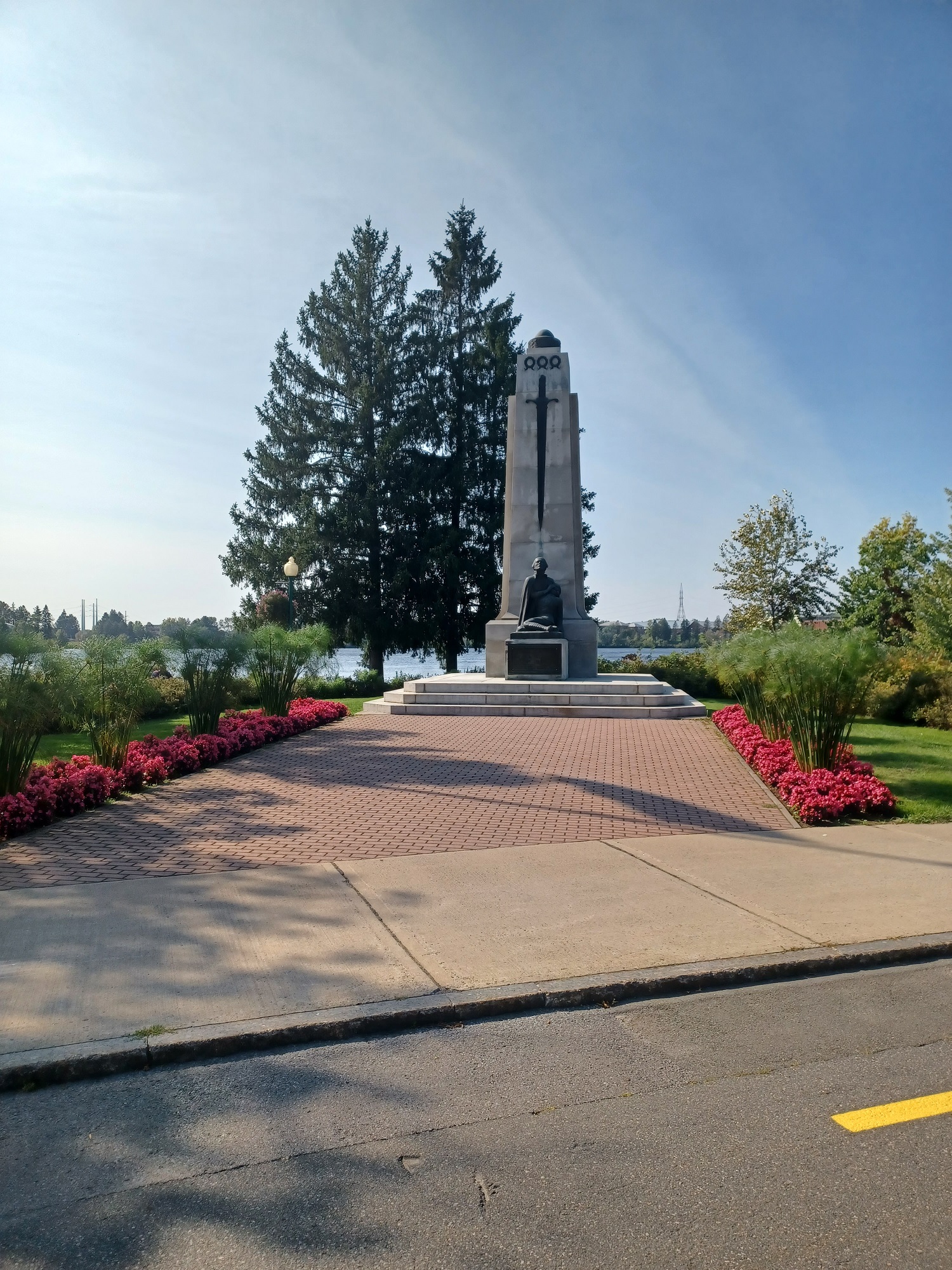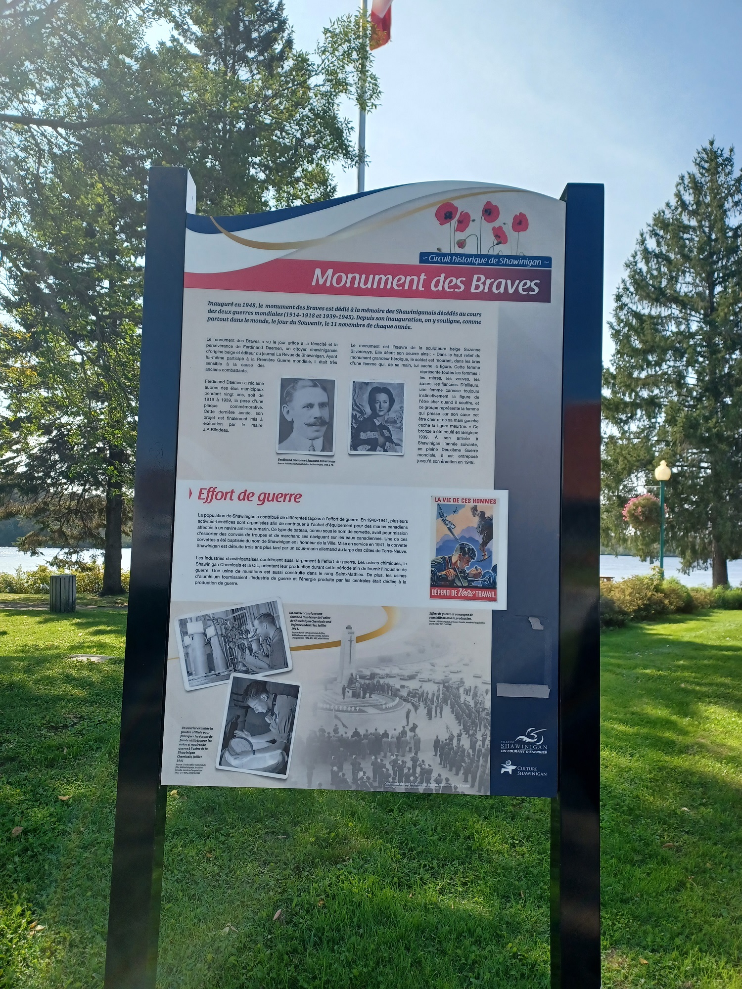 Ce monument honore la mémoire des braves de Shawinigan Falls tombés au champ d'honneur durant la Première et la Seconde Guerres mondiales. Il est modelé sur les stèles de la Grèce antique. Un glaive de bronze est monté sur chaque côté du monument au-dessous duquel? se trouvent trois couronnes de laurier. Au pied du monument il y a une statue en bronze d'une femme portant dans ses bras un soldat mourant dont le visage est partiellement caché par les mains de cette femme, ce qui rend le mourant plus anonyme, plus apte à évoquer le soldat inconnu que la ressemblance de quelqu'un en particulier.