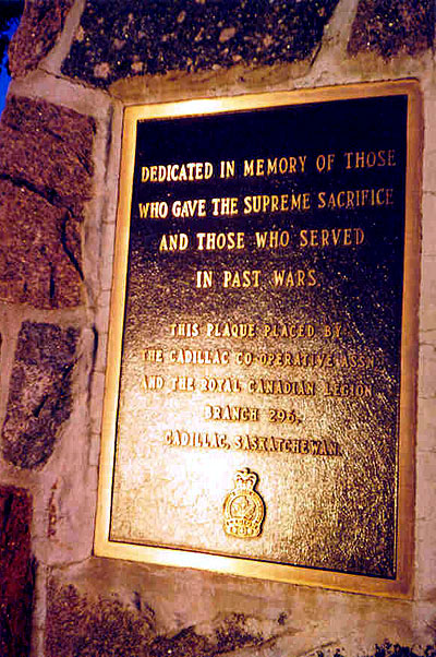 Ce mémorial a été érigé par la Cadillac Co-Operative Association et la filiale no 296 de la Légion royale canadienne en hommage à ceux et celles qui sont morts à la guerre.