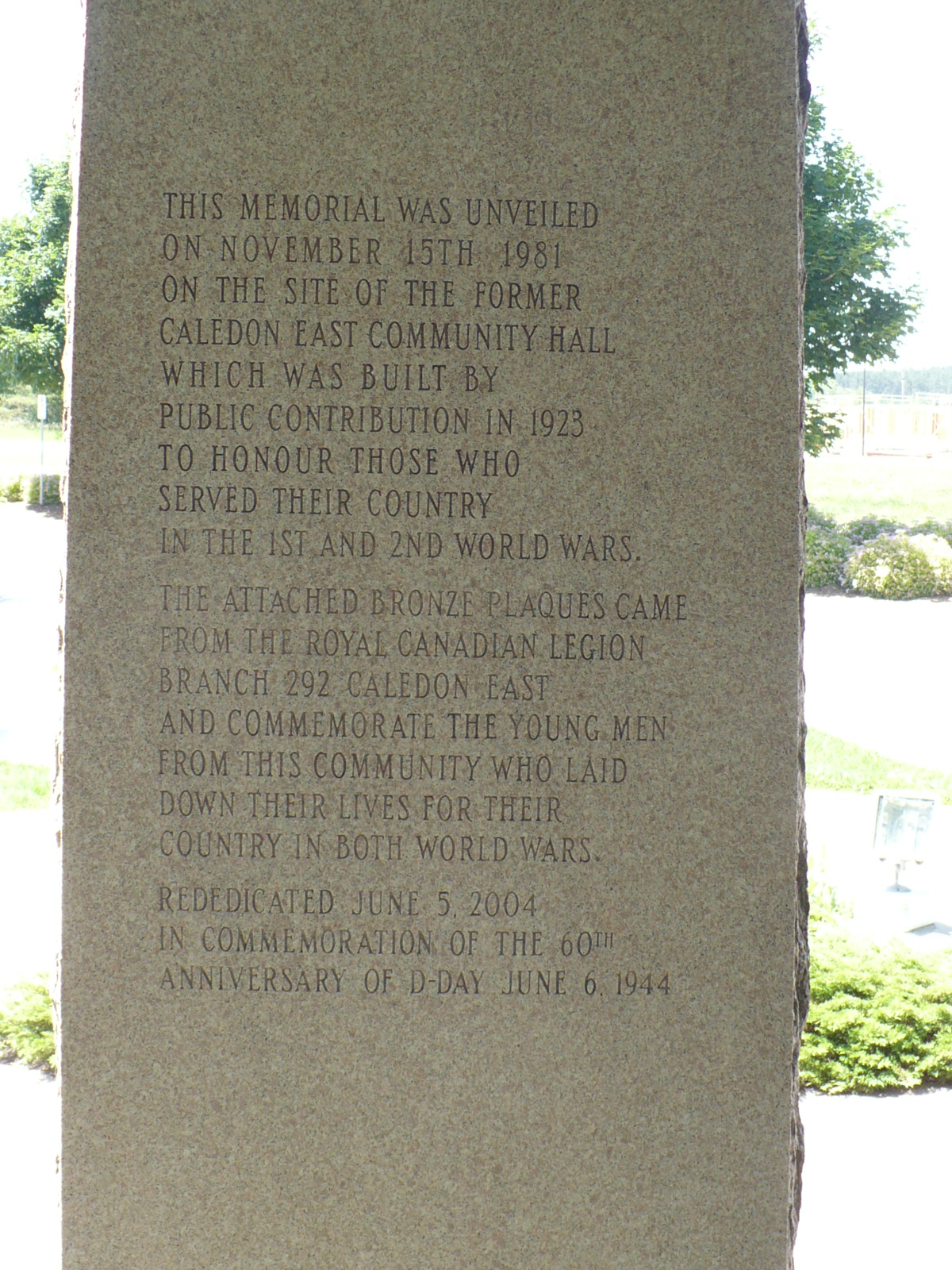 Les deux plaques en laiton du cénotaphe de Caledon East faisaient à l’origine partie d’un cénotaphe en béton situé devant la salle de la Légion de la filiale 292 de Caledon East. Le Caledon East Legion Hall a été construit en 1923 en hommage aux hommes qui ont servi pendant la Première Guerre mondiale. La Légion a d’abord acheté le bâtiment et le terrain (la moitié avant du lot 10) auprès de M. Evans. Le bâtiment a finalement été démoli, et une salle à un étage a été construite à sa place.