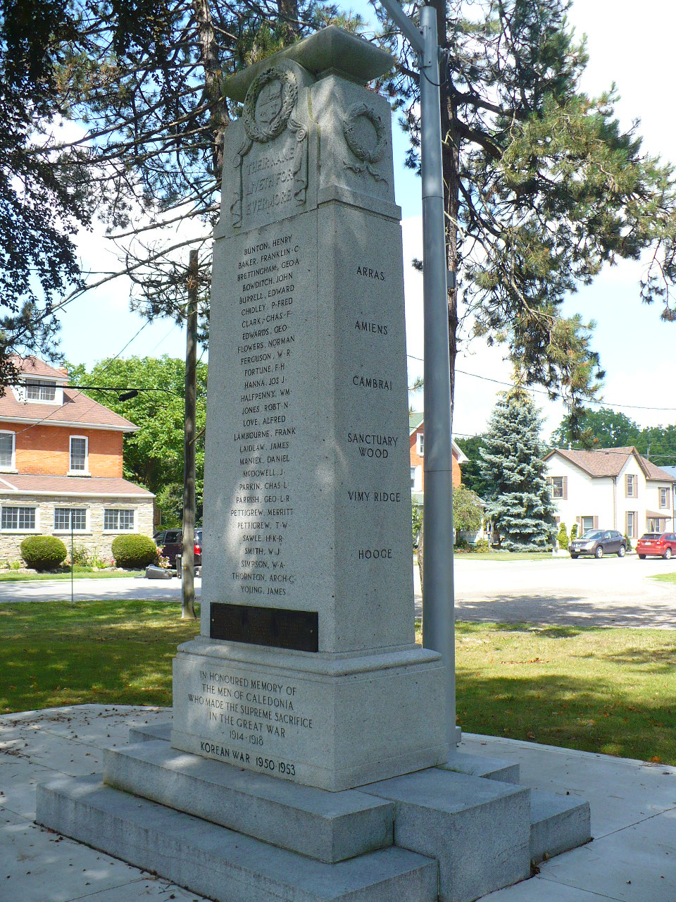 Ce mémorial fut érigé en l’honneur des 28 hommes de la région de Caledonia qui ont perdu la vie lors de la Grande Guerre. Une plaque de bronze y fut plus tard ajoutée pour commémorer les 20 hommes ayant perdu la vie lors de la Seconde Guerre mondiale. Les pertes de la guerre de Corée y sont aussi inscrites.