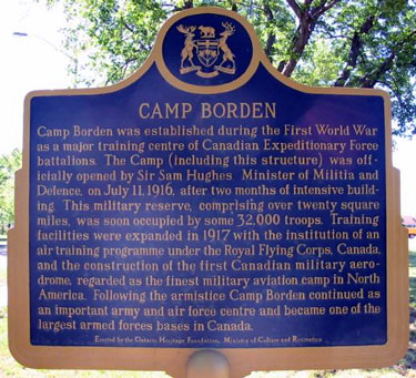 Érigé par la Fondation du patrimoine ontarien, du ministère de la Culture et des Loisirs, ce mémorial intitulé "CAMP BORDEN" rappelle les origines du camp Borden.