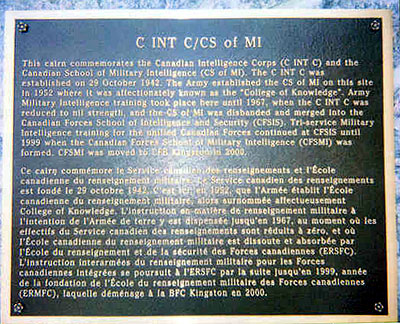 This cairn commemorates the Canadian Intelligence Corps (C INT C) and the Canadian School of Military Intelligence (CS of MI). The C INT C was established on 29 October 1942. The Army established the CS of MI on this site in 1952 where it was affectionately known as the "College of Knowledge". Army Military Intelligence training took place here until 1967, when the C INT C was reduced to nil strength, and the CS of MI was disbanded and merged into the Canadian Forces School of Intelligence and Security (CFSIS). Tri-service Military Intelligence training for the unified Canadian Forces continued at CFSIS until 1999 when the Canadian Forces School of Military Intelligence (CFSMI) was formed. CFSMI was moved to CFB Kingston in 2000.