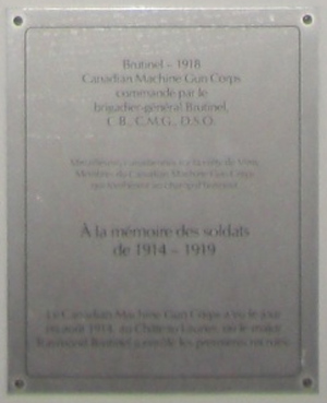 Ce monument commémoratif consiste en un groupe de trois plaques suspendues au même mur, l’une en dessous de l’autre. Sur la grande plaque se trouve un « bas-relief » circulaire du buste du Brigadier-général Brutinel et un « bas-relief » représentant des mitrailleurs sur la crête de Vimy. Les plaques ont été produites en l’honneur des membres du Corps canadien de mitrailleuses qui sont morts en service actif ainsi que de tous ceux qui ont servi. Elles sont aussi dédiées à la mémoire du Brigadier-général R. Brutinel, CB, CMG, DSO, qui commandait le Corps canadien de mitrailleuses. En août 1914, le Major Raymond Brutinel a enrôlé les premières recrues du Corps, ici même, au Château Laurier.