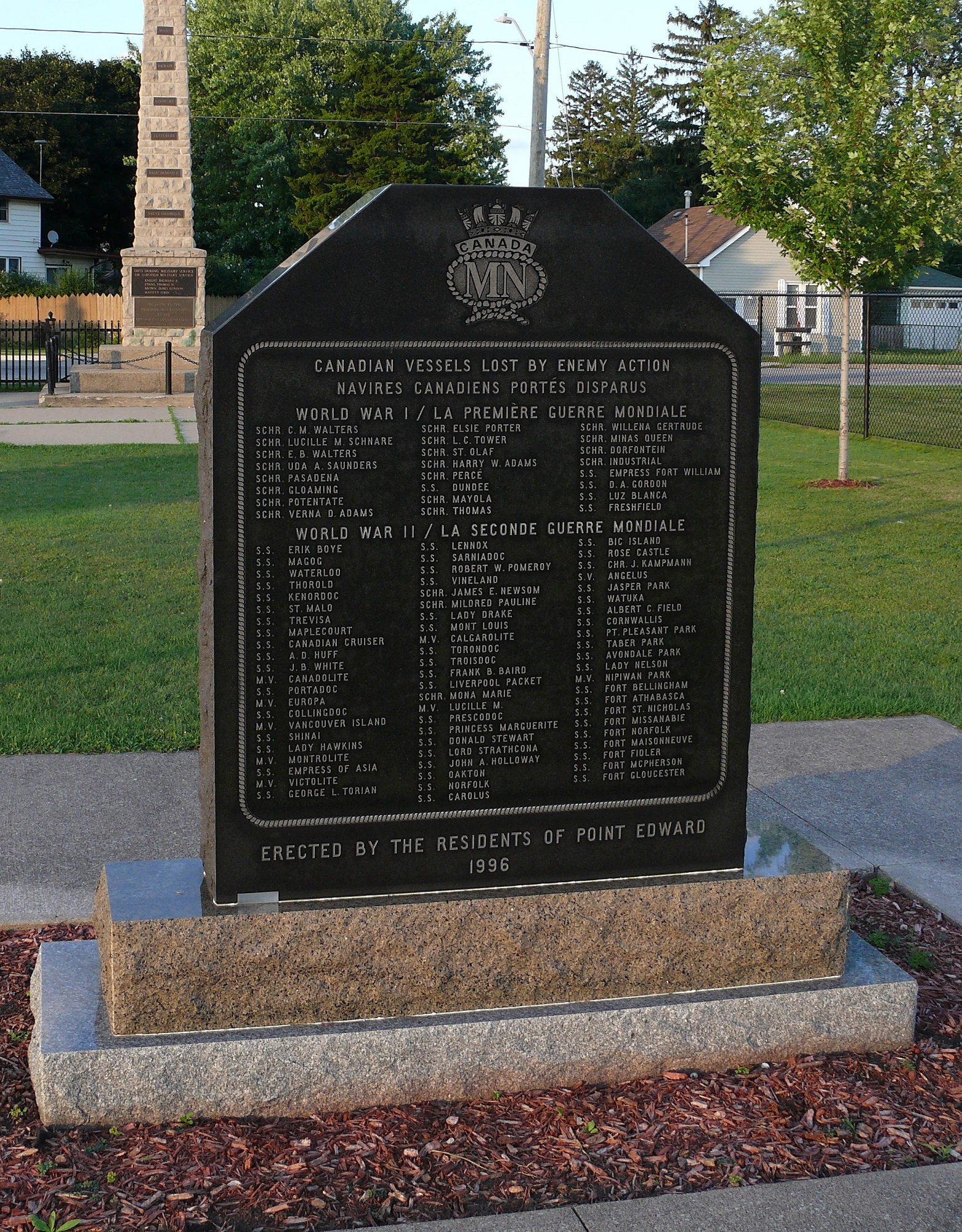 Ce mémorial à la Marine marchande est dédié aux navires et aux marins de la Marine marchande du Canada qui ont participé aux Première et Seconde Guerres mondiales et à la guerre de Corée. Il a été érigé en 1996 par les résidents de Point Edward.