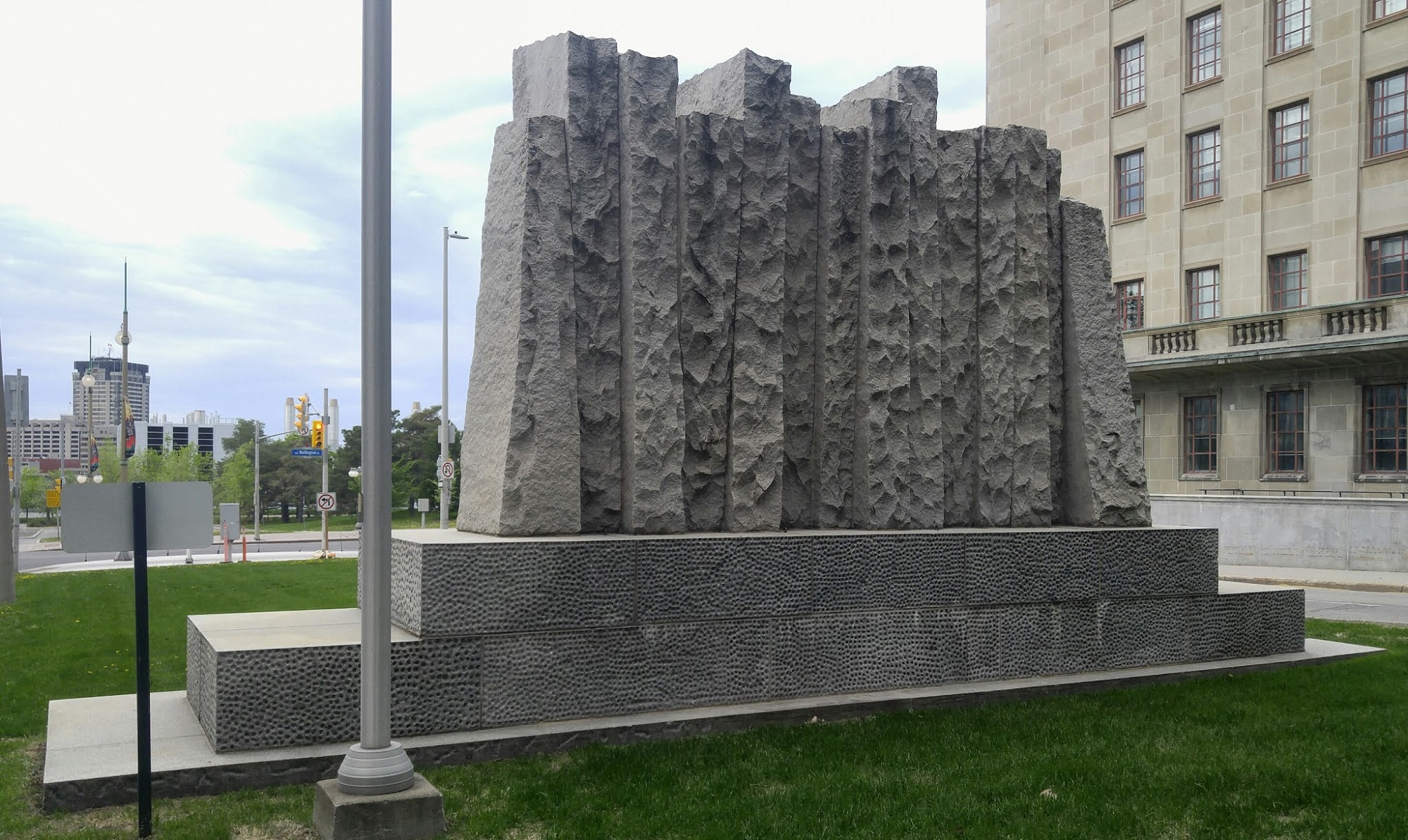 Le panneau de pierre pèse trois tonnes et demie et mesure près de trois mètres de long et deux mètres de haut. L'encadrement en granit gris, qui rappelle les majestueux pylônes du Monument commémoratif du Canada à Vimy, a été conçu par M. B.A. Topolski, un architecte de la région de la Capitale nationale.