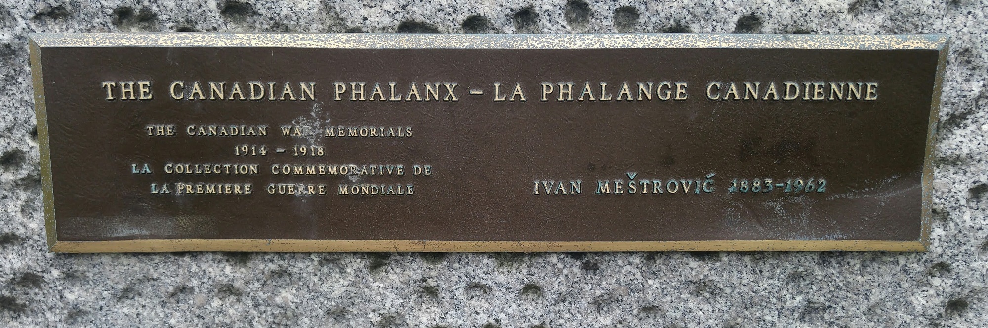 Pendant la Première Guerre mondiale, un comité présidé par lord Beaverbrook a commandé une importante collection d’art documentaire visant à commémorer la participation du Canada à la guerre. La collection « Souvenirs de guerre canadiens », remise au Canada en 1920, inclut le bas-relief de marbre intitulé « The Canadian Phalanx » (La Phalange canadienne), réalisé par le sculpteur yougoslave Ivan Mestrovic. Le cadre architectural en granit dans lequel a été placée l’œuvre a été créée en 1972 par D.A. Topolski. (Archives de la Ville d’Ottawa)