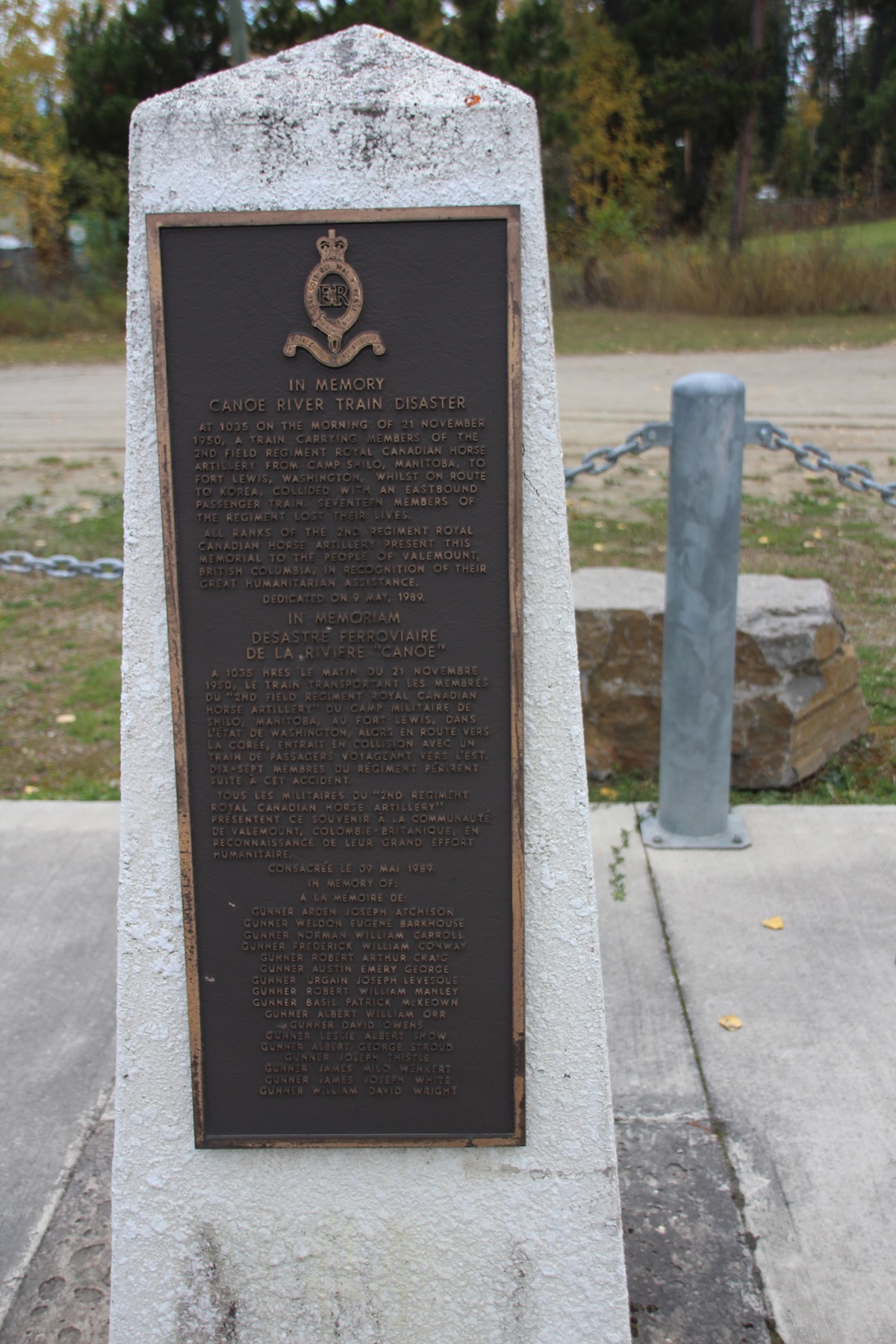 En mai 1989, un monument a été érigé à la filiale Valemount-266 de la Légion royale canadienne (C.-B./Yukon), et a été inauguré par le 2e Régiment d’artillerie de campagne, Royal Canadian Horse Artillery, en souvenir des camarades morts en route vers la Corée, le 21 novembre 1950. Dix-sept artilleurs ont en effet perdu la vie lorsque leur train est entré en collision, à six kilomètres au sud de Valemount, avec un train de passagers circulant en direction nord.