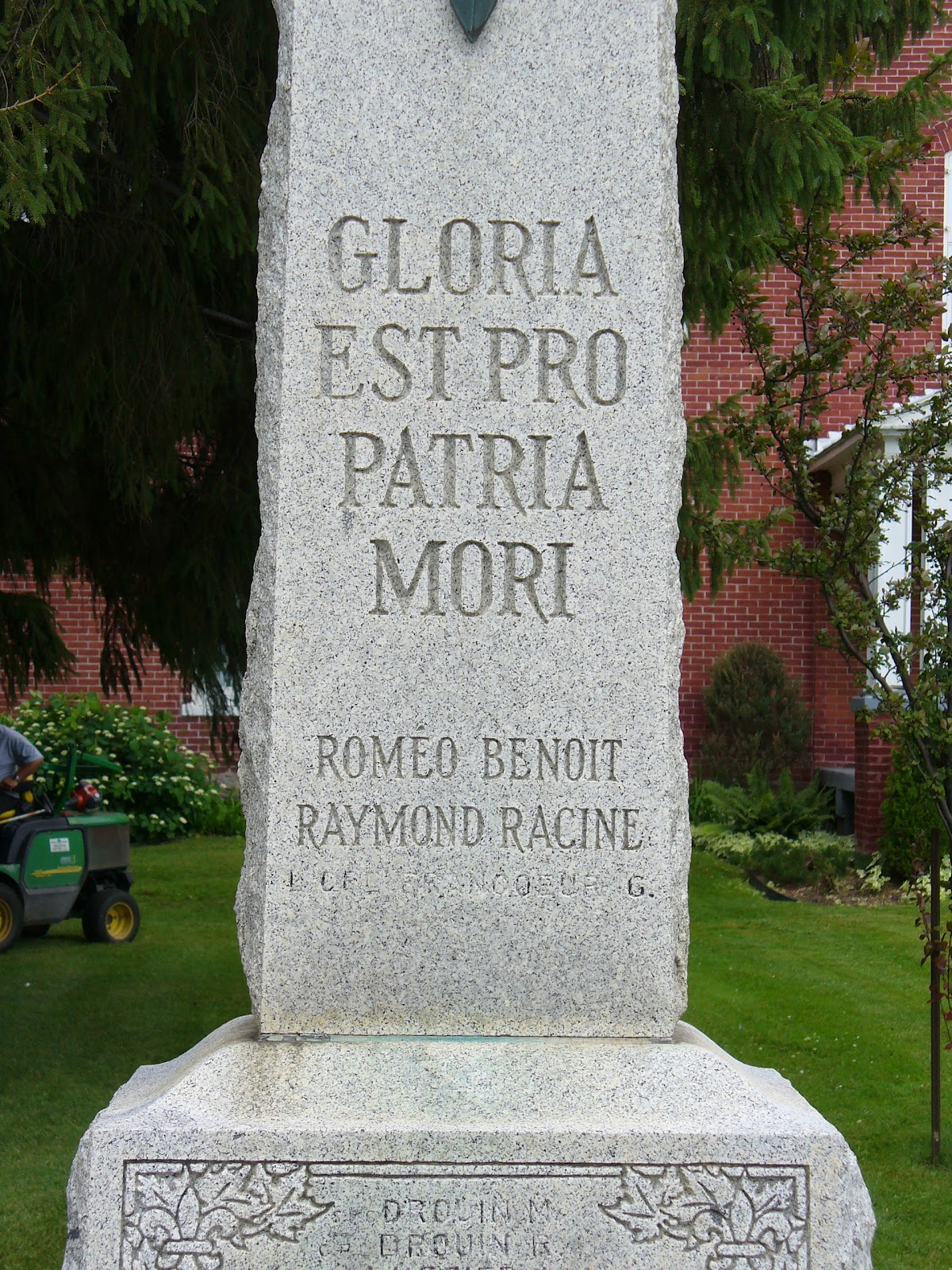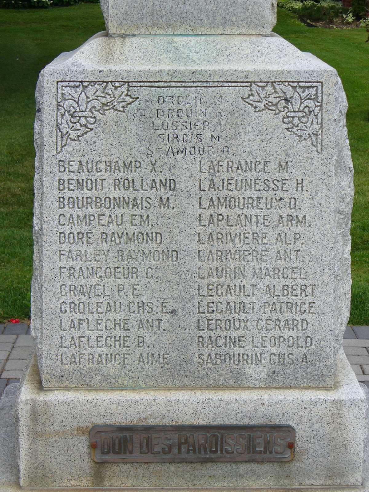 Le cénotaphe était d’abord situé à droite de l'église, là où il y a le stationnement aujourd’hui. Plus tard, on le déménagea devant le presbytère, où il est toujours. Encore aujourd’hui, le cénotaphe, réunit les gens lors du Jour du Souvenir, chaque automne.