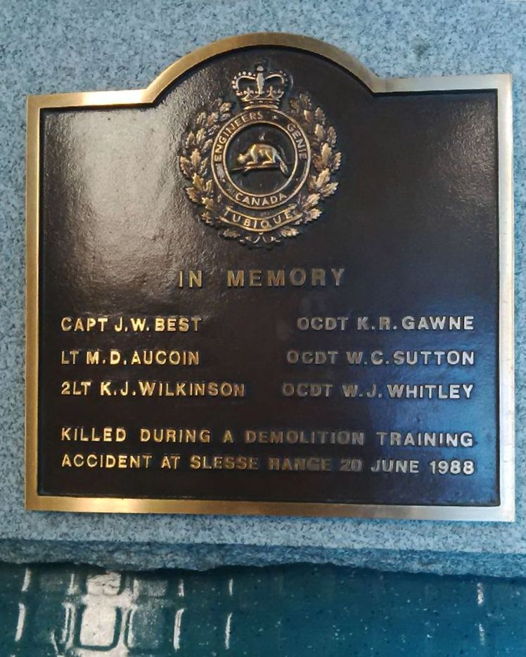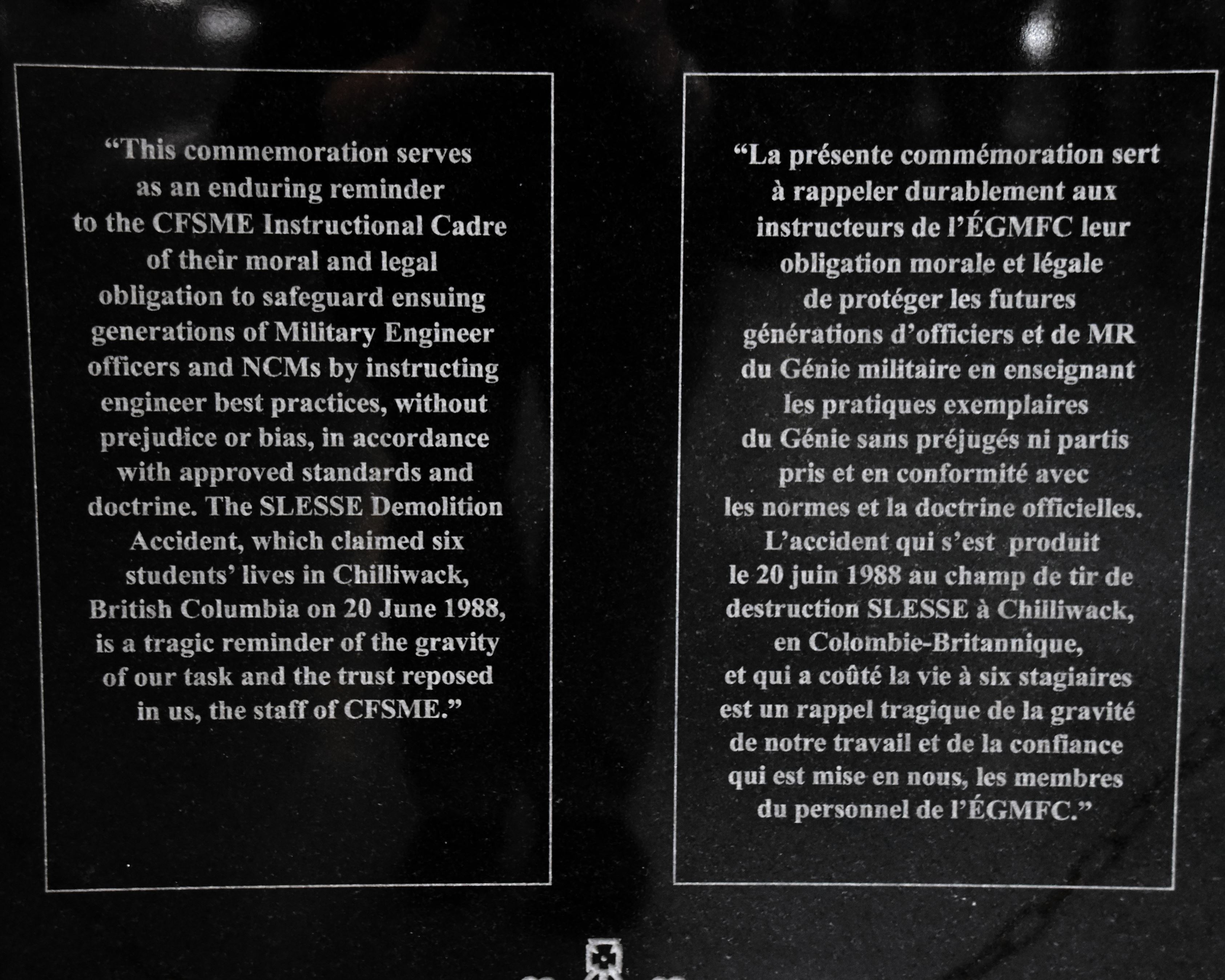 Ce monument a été dévoilée à la mémoire des six étudiants victimes de l’accident survenu en juin 1988 dans le secteur de démolition Slesse de l’École du génie militaire des Forces canadiennes Chilliwack (C.-B.). À l’origine, le monument commémoratif a été dévoilé à l’École du génie militaire des Forces canadiennes de la BFC Chilliwack, pour ensuite être dévoilé de nouveau à Gagetown au moment où l’école a déménagé au Nouveau-Brunswick. Ce monument est constitué d’une plaque de cuivre et d’une dalle noire, toutes deux reposant sur un socle de granite gris.