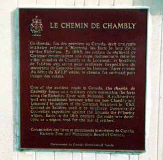 One of the earliest roads in Canada, the chemin de Chambly began as a military route connecting the forts along the Richelieu River with Montréal. A rudimentary trail was established between what are now Chambly and Longueuil by soldiers of the Carignan Regiment in 1665, Colonel de Salières used it to reinforce Governor de Courcelle's expedition against the Iroquois the following winter. Early in the 18th century the route was developed as a wagon road for the use of settlers.