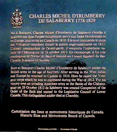 Born at Beauport Charles Michel d'Irumberry de Salaberry joined the British army at the age of fourteen. After serving in the West Indies and Europe he returned to Canada in 1810. Here he raised the Voltigeur corps which he was to command during the War of 1812. For his victory over an invading American army at the Battle of the Châteauguay on 26 October 1813 de Salaberry was created Companion of the Order of the Bath and named to the Legislative Council of Lower Canada. This distinguished soldier died at Chambly.