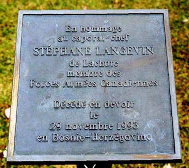 Cette plaque est dédiée à la mémoire du caporal-chef Stéphane Langevin de Lachute qui est décédé en devoir lors d'une mission de paix de l'ONU en Bosnie-Herzégovine en 1993.