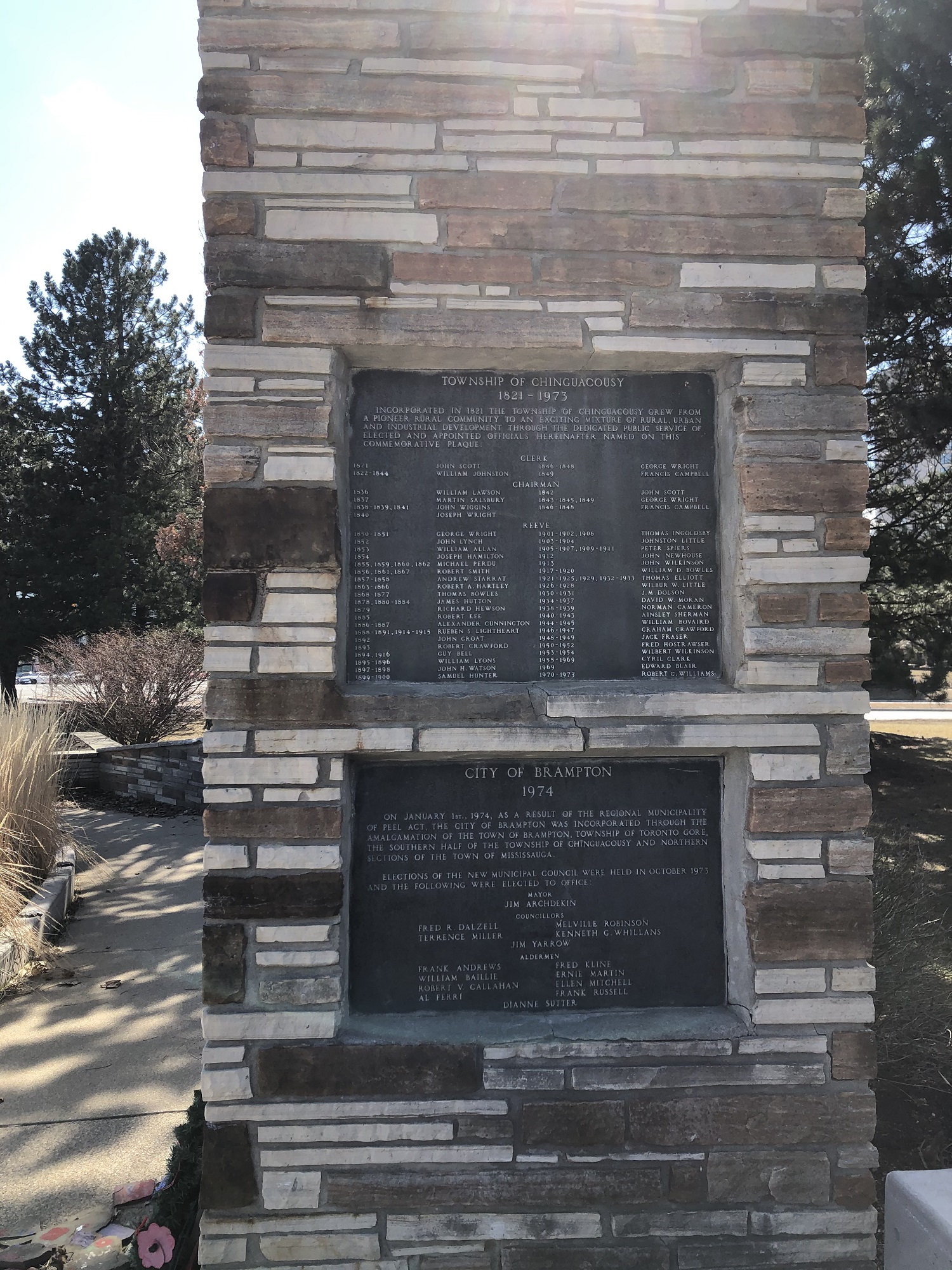 Dans le coin sud-ouest du parc Chinguacousy, un monument commémoratif est dédié aux victimes de deux conflits mondiaux et de nombreuses missions des Nations Unies. Deux ans après l’incorporation de la ville de Brampton, la filiale no 609 de la Légion royale canadienne à Bramalea a érigé un monument commémoratif dédié aux victimes du canton de Chinguacousy, de la Ville de Brampton et de Toronto Gore. Il y a eu une inauguration à l’occasion du cinquantième anniversaire de la Légion royale canadienne en 1976.