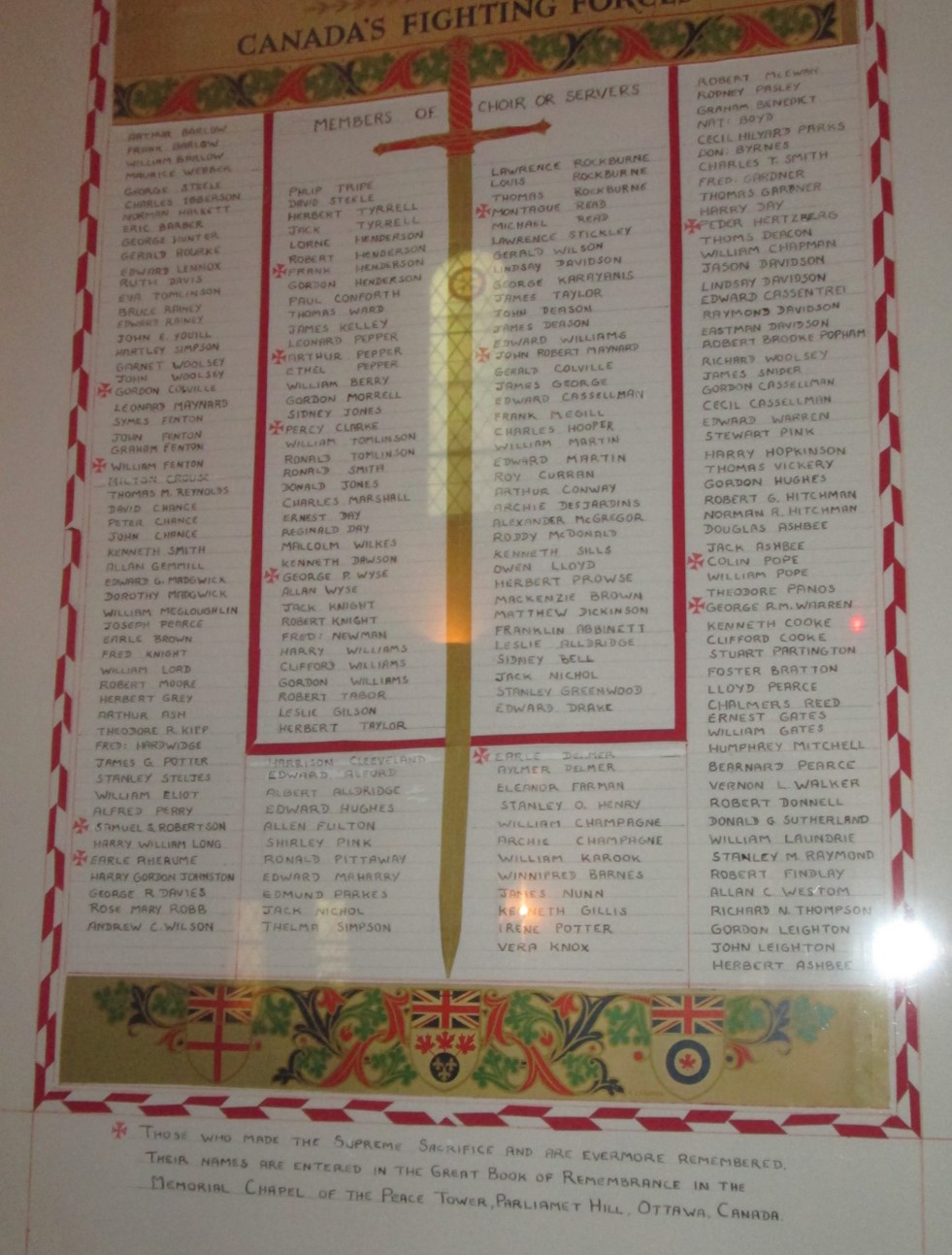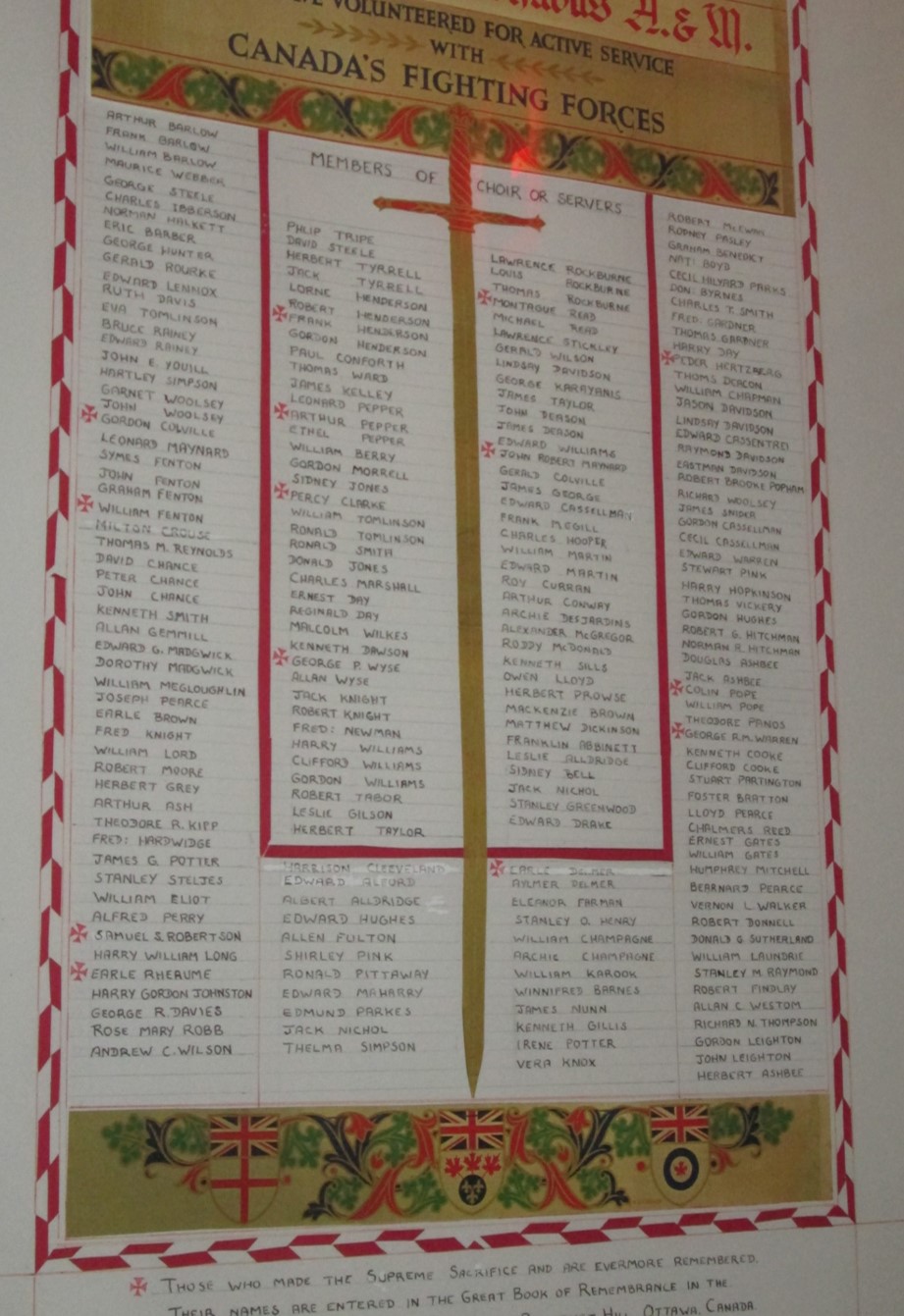 Ce monument commémoratif est un parchemin encadré contenant les noms des membres de l’église de St. Barnabas, Apostle and Martyr qui ont servi pendant la Seconde Guerre mondiale.