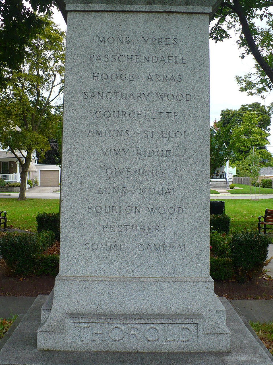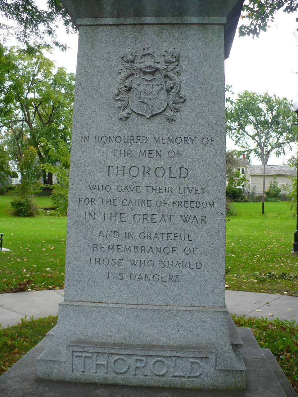 «Le mémorial militaire de Thorold, érigé par les citoyens de Thorold dans le parc commémoratif, a été inauguré le dimanche 30 octobre 1921 à 2 h 30 de l’après-midi. Il a été érigé à la mémoire des hommes de Thorold qui ont donné leur vie pour la cause de la liberté pendant la Grande Guerre, et en témoignage de reconnaissance pour ceux qui en ont partagé les risques.