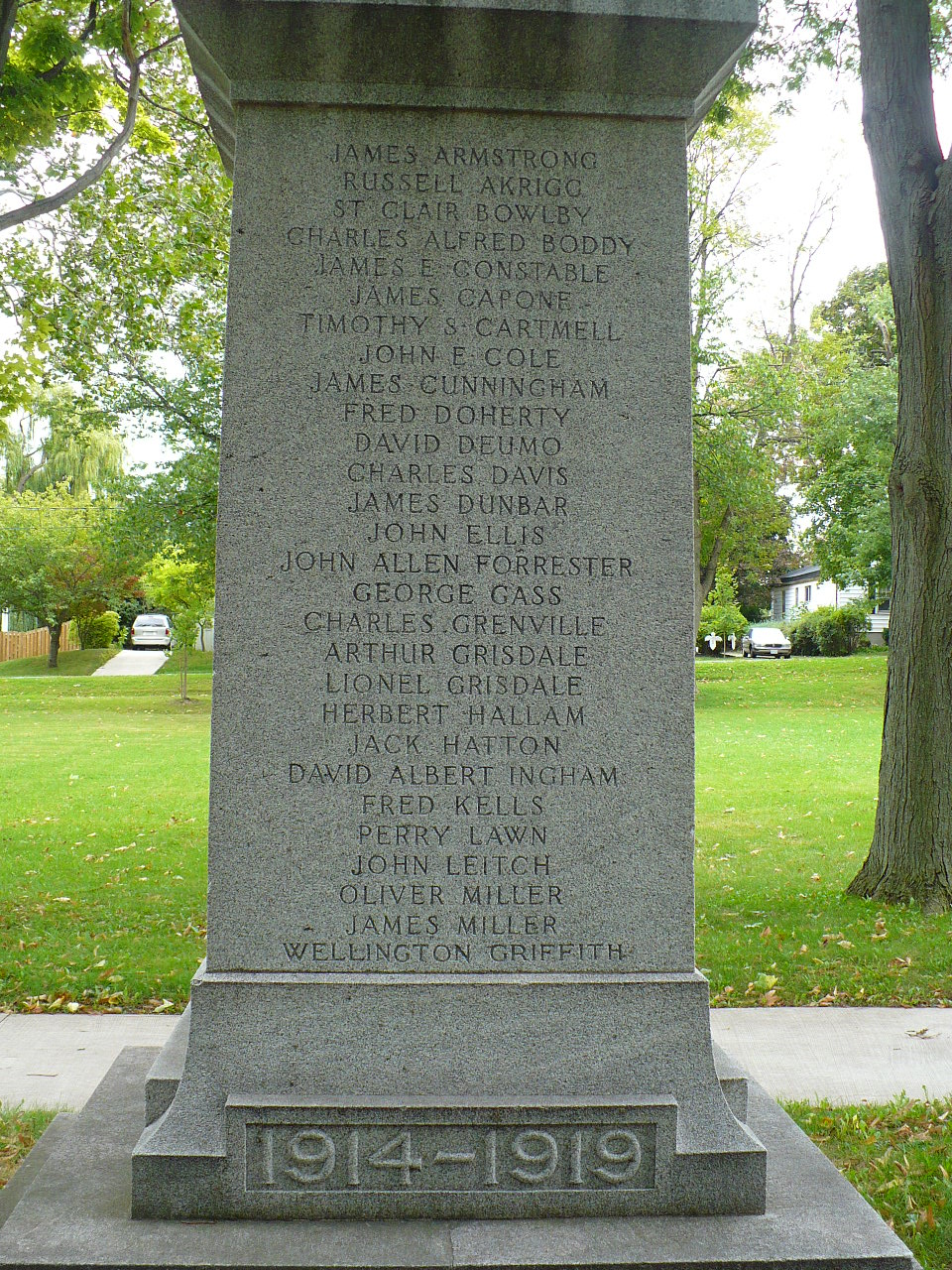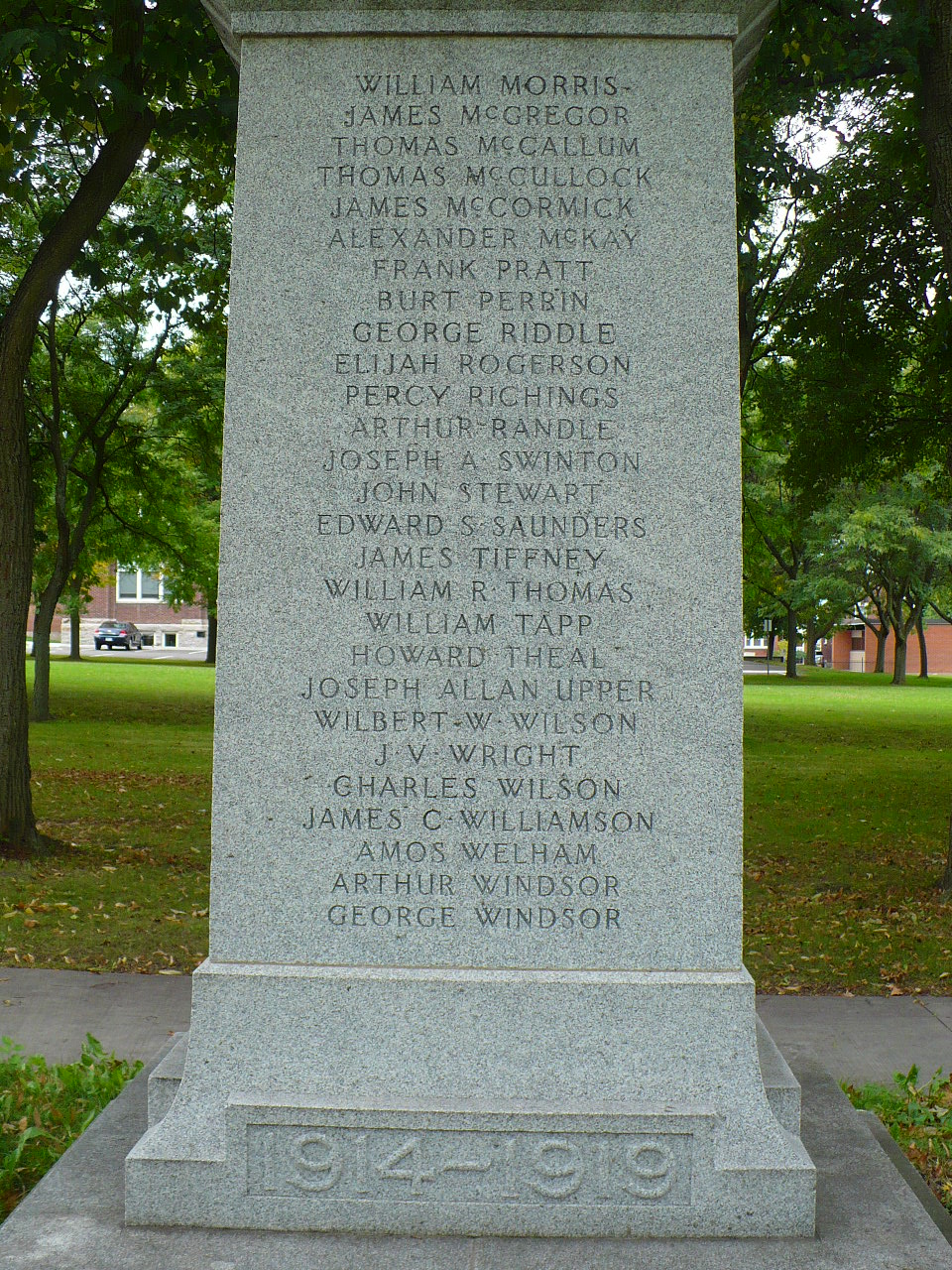 Il s’agit d’une construction massive et magnifique, d’environ 17 pieds de hauteur totale, posée sur une base triple. Les fonds nécessaires à la construction de ce monument aux morts ont été recueillis par la Thorold Reed Band sous la direction de M. W.A. Philip. Le magnifique programme de 16 pages qui sera distribué par le comité contiendra les portraits de toutes les personnes mentionnées, ou presque puisque certains de ces portraits ne sont pas disponibles.