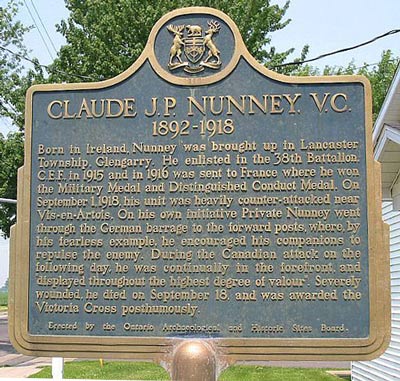 Ce mémorial dédié à Claude J.P. Nunney, V.C., a été érigé en 1962 par le Conseil des lieux archéologiques et historiques de l’Ontario.