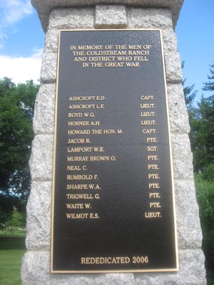 IN MEMORY OF THE MEN OF THE COLDSTREAM RANCH AND DISTRICT, WHO FELL IN THE GREAT WAR