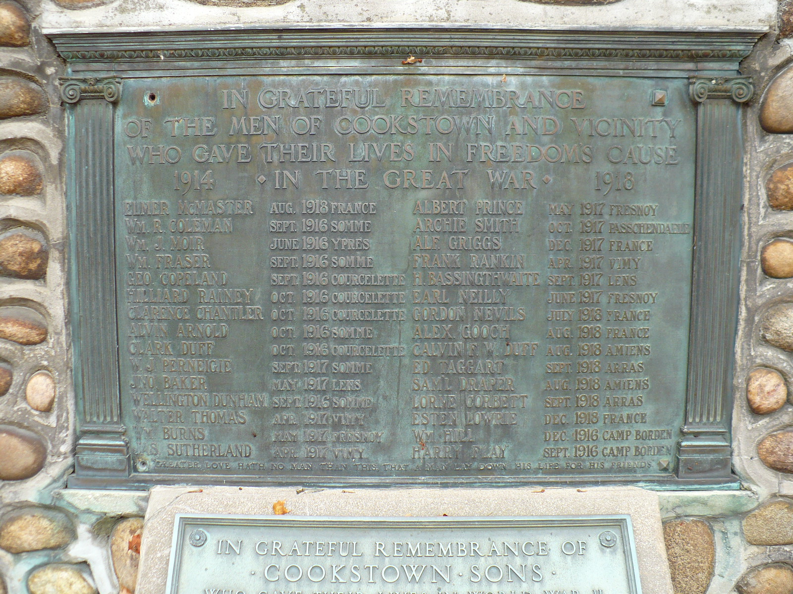 Ce monument, situé dans le parc commémoratif des vétérans, a été inauguré en 1935. Il a été conçu et construit par Alfred Davis. La plaque qui se trouve sur le monument était un cadeau du Cookstown Women's Institute et a été dévoilée initialement le 11 avril 1921 dans une banque à Cookstown.