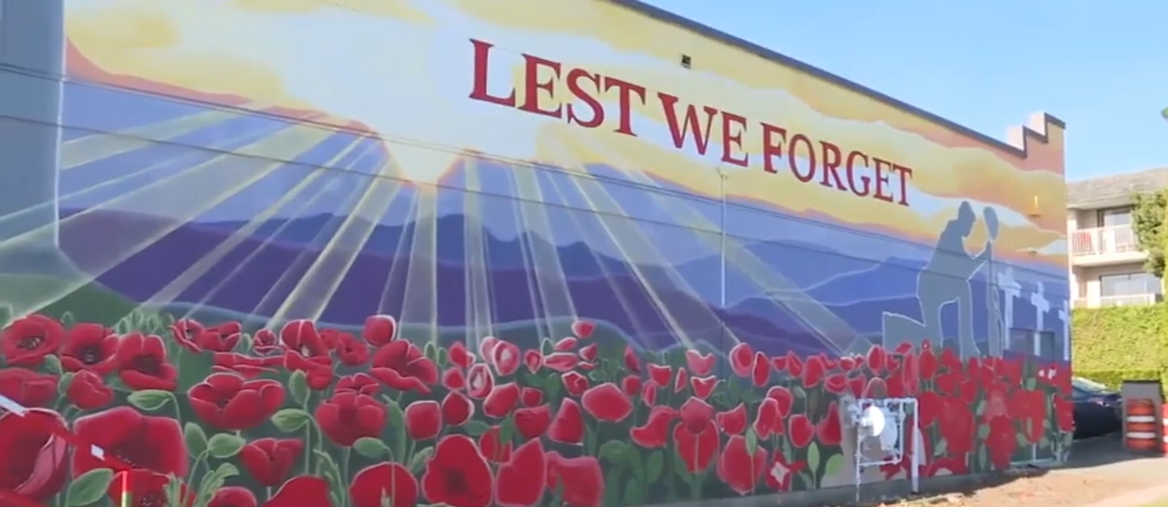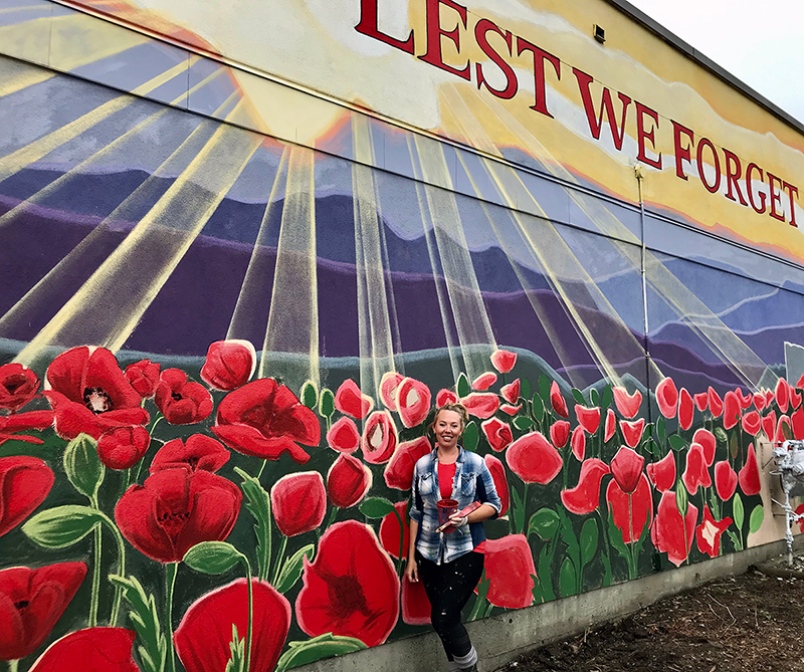 Laura Johnson was commissioned by the Royal Canadian Legion Coquitlam Branch to paint a mural in 2019. The veteran's tribute features a field of poppies and graves of soldiers from the Great War, World War II and Afghanistan War.