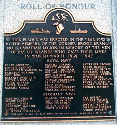 THIS PLAQUE WAS ERECTED IN THE YEAR 1952 BY THE MEMBERS OF THE CORNER BROOK BRANCH NO. 13, CANADIAN LEGION, IN MEMORY OF THE MEN OF BAY OF ISLANDS WHO GAVE THEIR LIVES IN WORLD WAR II 1939 - 1945