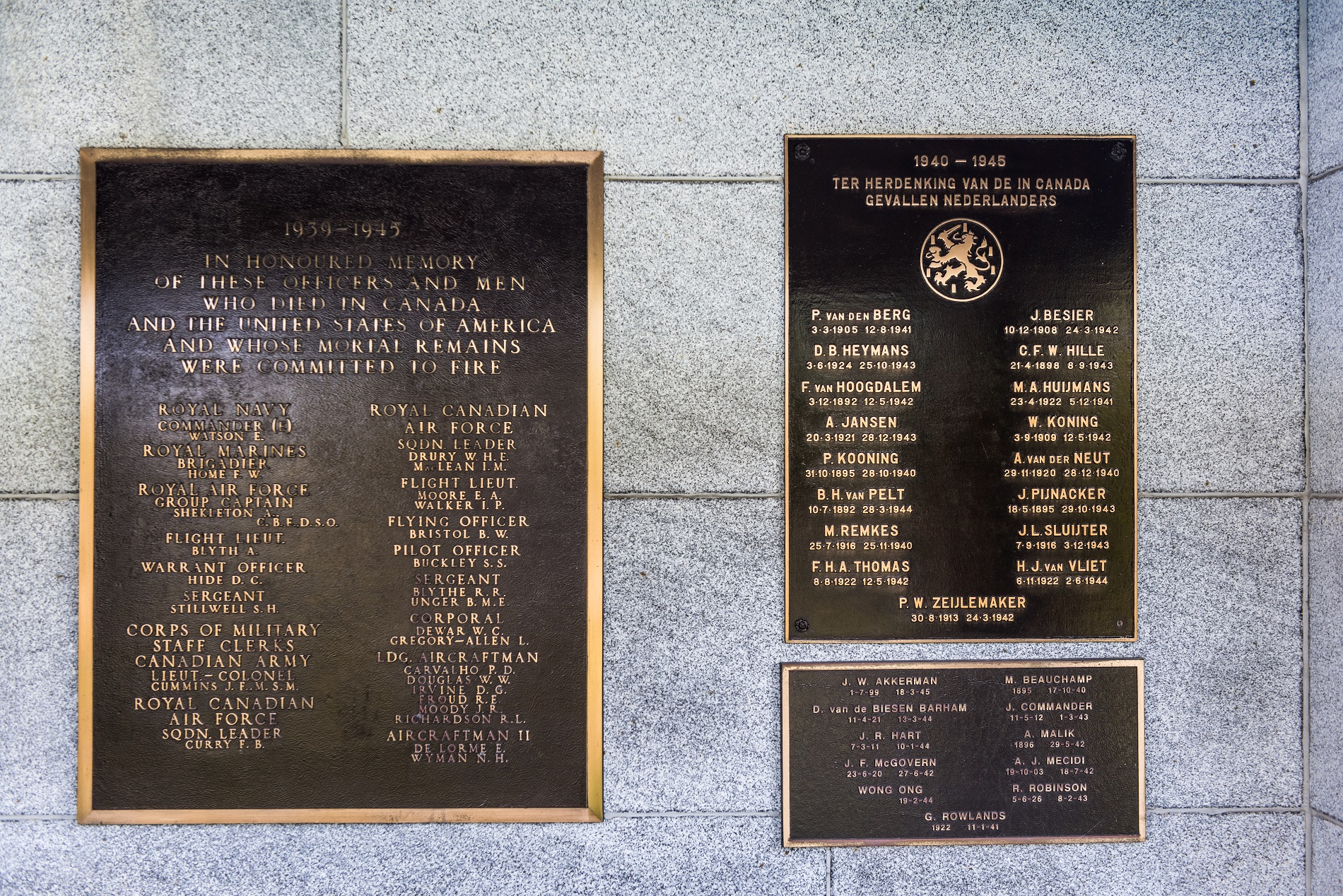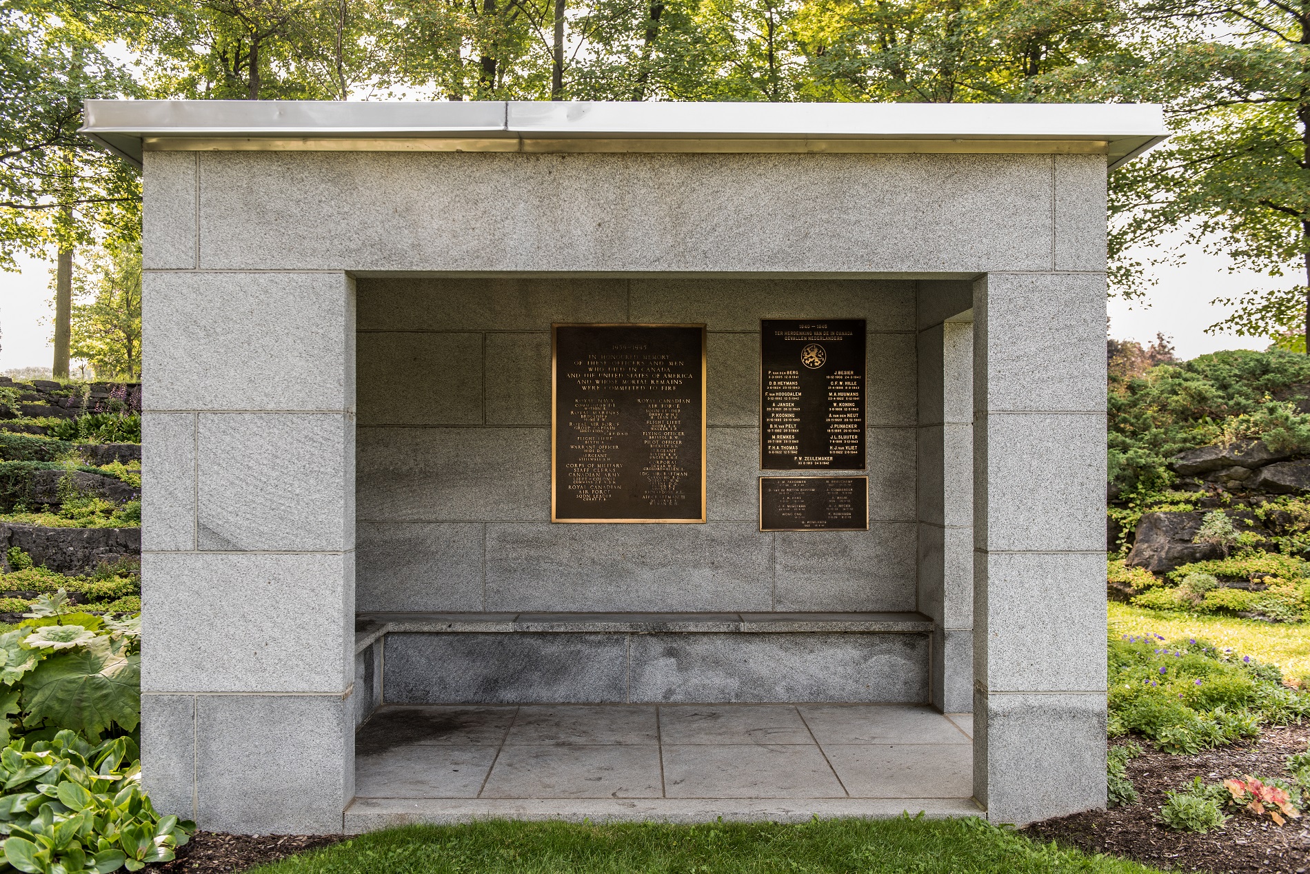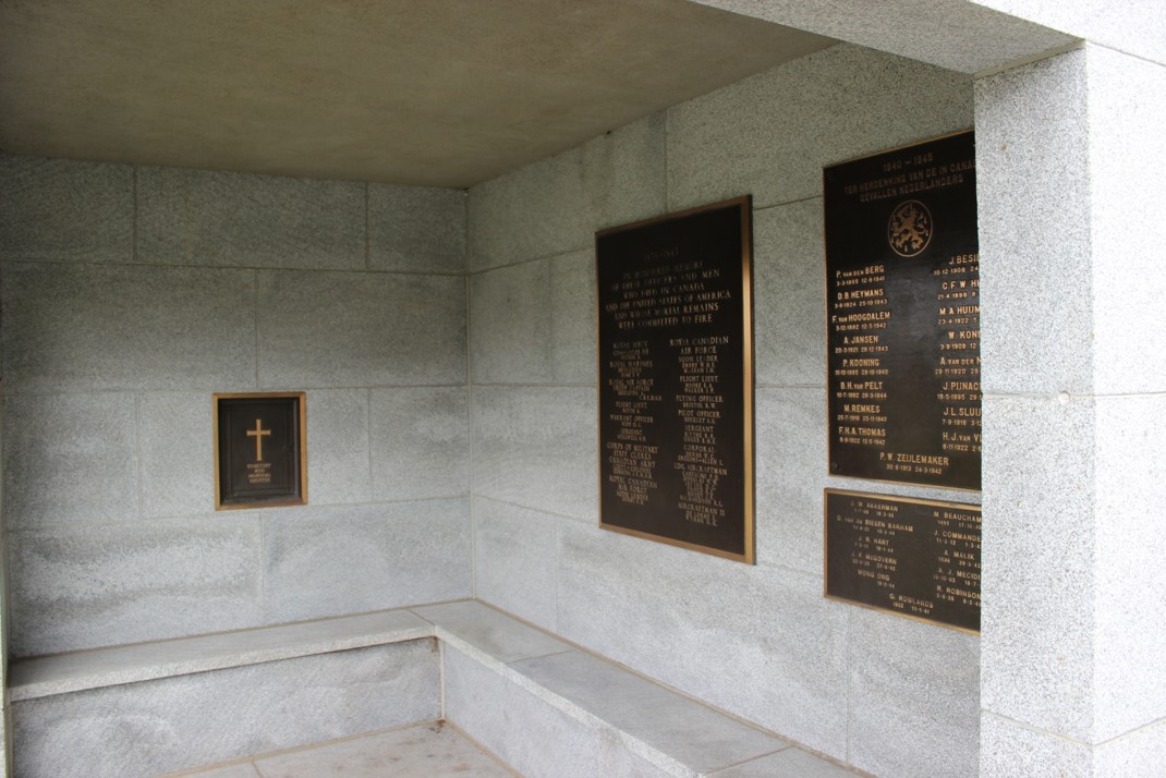 Depuis 1971, le Monument commémoratif d’incinération affiche également des plaques en l’honneur de 28 morts de guerre néerlandais dont les tombes sont entretenues par l’Agence canadienne de la Commission au nom des Pays?Bas.