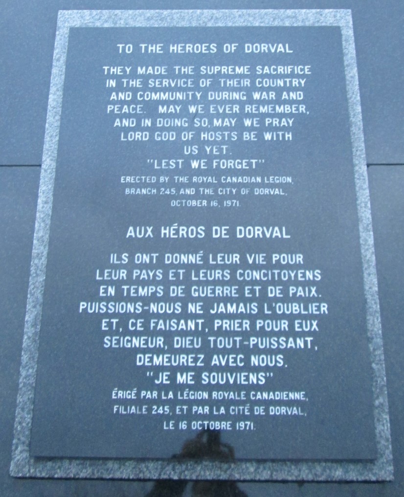 AUX HÉROS DE DORVAL, ILS ONT DONNÉ LEUR VIE POUR LEUR PAYS ET LEURS CONCITOYENS, EN TEMPS DE GUERRE ET DE PAIX. PUISSIONS-NOUS NE JAMAIS L'OUBLIER ET, CE FAISANT, PRIER POUR EUX. SEIGNER DIEU TOUT-PUISSANT DEMEUREZ AVEC NOUS. "JE ME SOUVIENS".