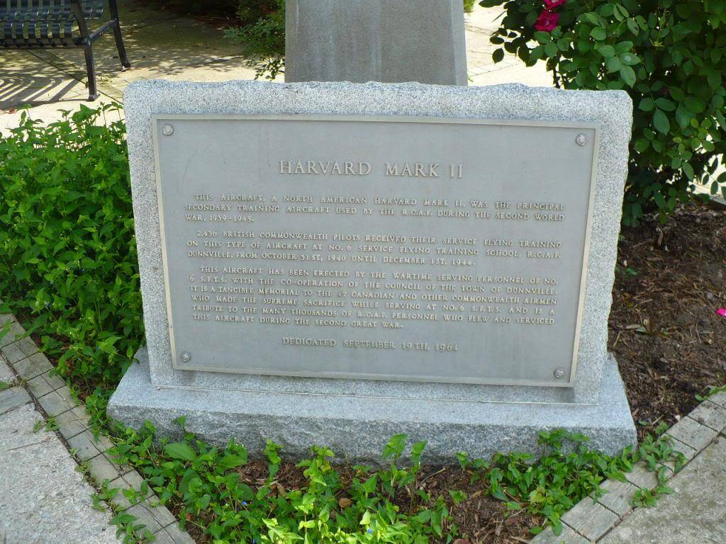Ce monument commémoratif, dédié à l’École de pilotage militaire no 6, fut érigé par des anciens membres de l’École et par le ministère de la Culture et des Communications de l’Ontario. Dunnville accueillait l’École de pilotage militaire no 6 durant la Seconde Guerre mondiale. Cet Harvard Mark II fut le principal avion d’entraînement pour des milliers d’aviateurs envoyés en Grande-Bretagne.