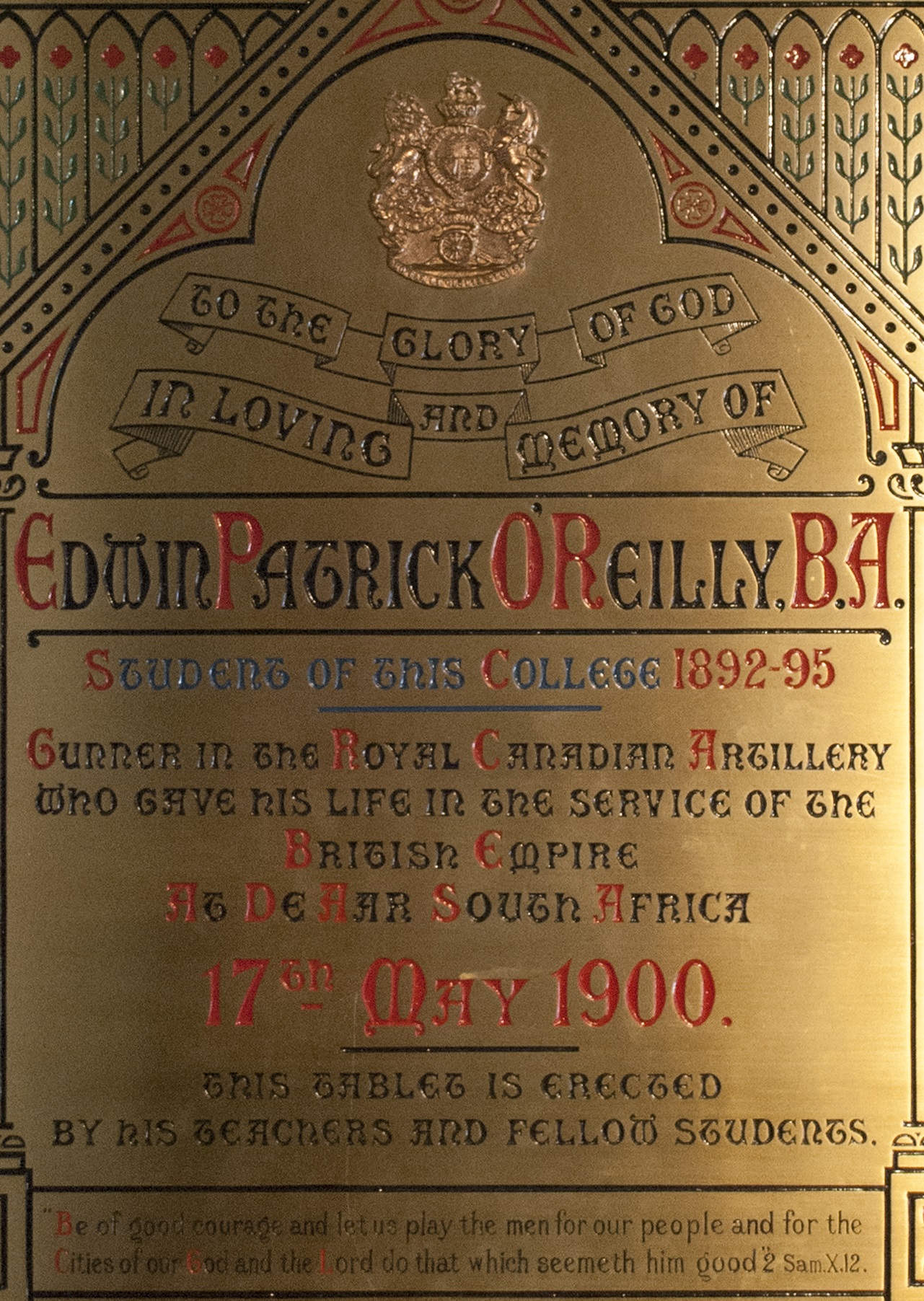 This plaque was erected in memory of Edwin Patrick O’Reilly who gave his life in the South African War. It is thought that the plaque was likely erected in the original Trinity College chapel on Queen Street West in Toronto. The college moved from that location in 1925. After a new chapel was built in 1955 at the current location, all of the early plaques from the original location were moved to the narthex.