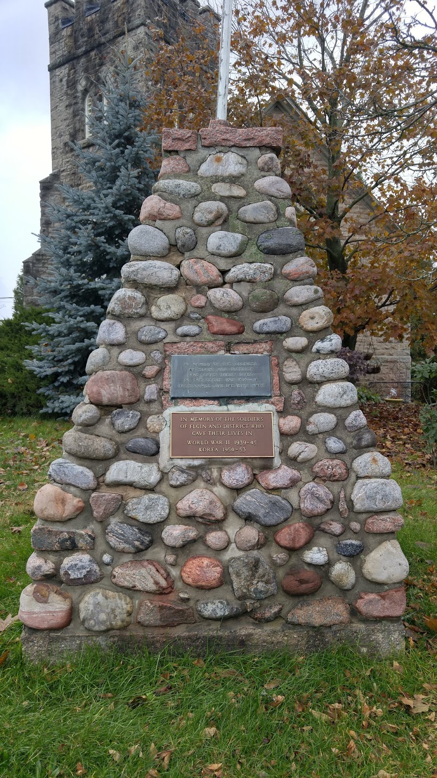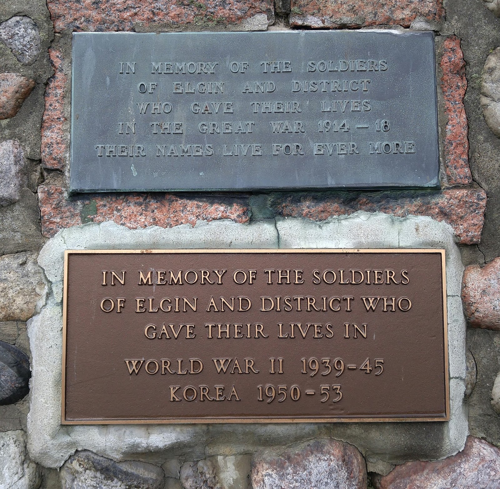 Le premier cénotaphe d’Elgin était un cairn en pierre de dix pieds de haut, orné de deux plaques commémoratives à la mémoire des soldats d’Elgin et de la région avoisinante, qui ont donné leur vie durant la Première Guerre mondiale, la Seconde Guerre mondiale et la guerre de Corée. Le cénotaphe d’Elgin était situé à l’extérieur de l’église anglicane St. Paul, au 7, rue Perth.