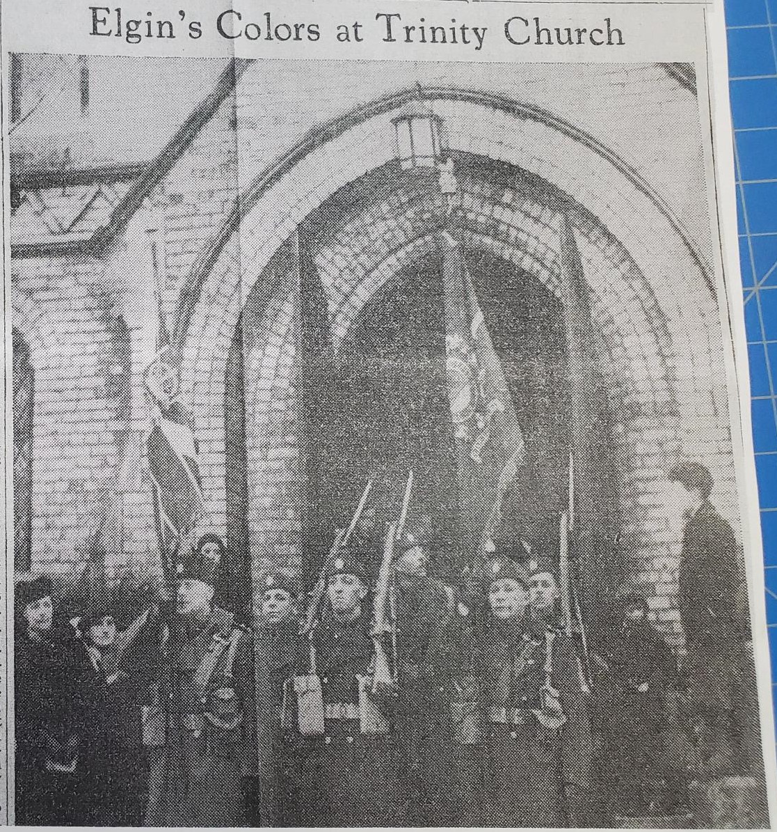 Le 25e Bataillon d’infanterie d’Elgin a été créé à St. Thomas le 14 septembre 1866. Pendant la Première Guerre mondiale, le régiment a fourni des soldats au 91e Bataillon du Corps expéditionnaire canadien (CEC). Après la guerre, le régiment a été rebaptisé The Elgin Regiment et obtenu la perpétuation du 91e Bataillon de la Première Guerre mondiale. Le régiment a porté les drapeaux consacrés du 91e Bataillon du CEC de 1921 à 1935, lorsque ceux-ci ont été accrochés à l’église anglicane Trinity dans la rue Southwick. Le 28 juin 1936, le régiment de l’Ordre impérial des filles de l’Empire de St. Thomas a remis à The Elgin Regiment ses propres drapeaux consacrés. The Elgin Regiment a été appelé le 24 mai 1940 pour servir pendant la Seconde Guerre mondiale et ses drapeaux consacrés ont été accrochés à l’église le 12 janvier 1941.