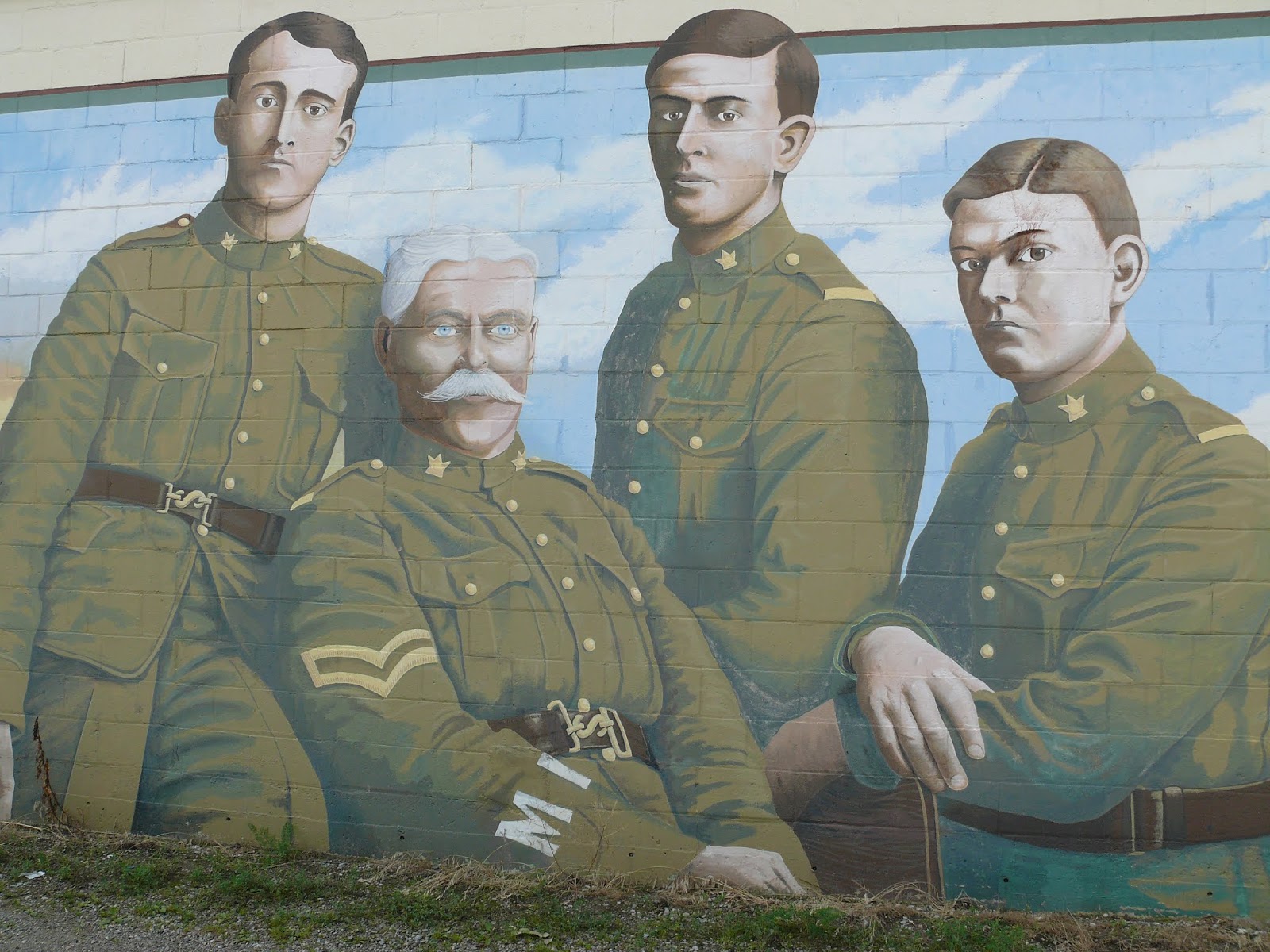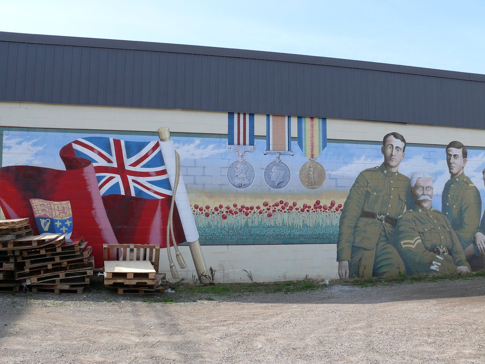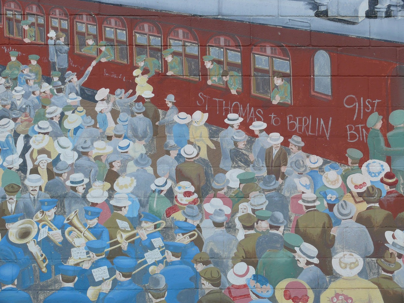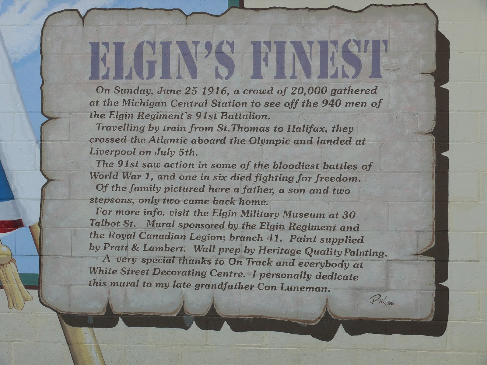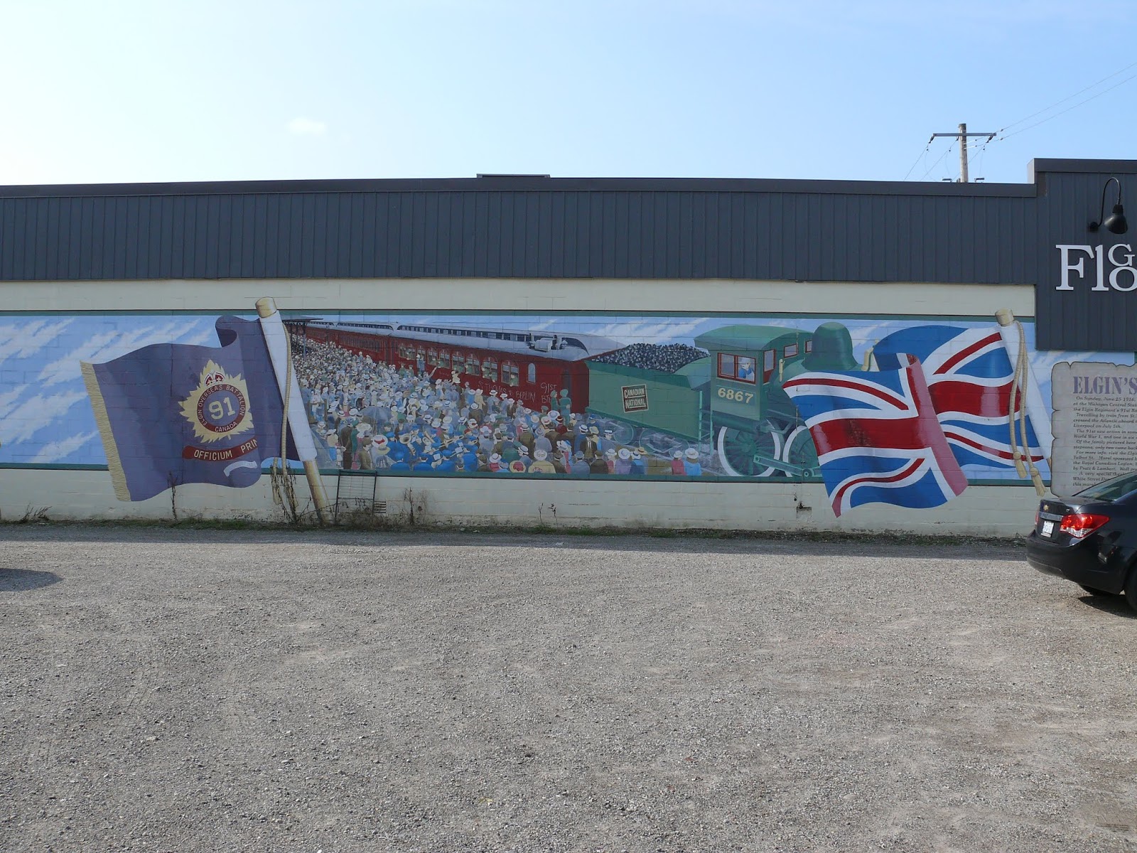 La murale Elgin’s Finest a été peinte par l’artiste Rikk Johnston et rend hommage aux nombreux hommes du 91e Bataillon du Corps expéditionnaire canadien du comté d’Elgin et aux chemins de fer qui ont été utilisés pour transporter les soldats, les armes et les vivres durant la Première Guerre mondiale.