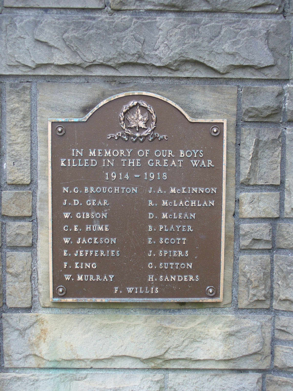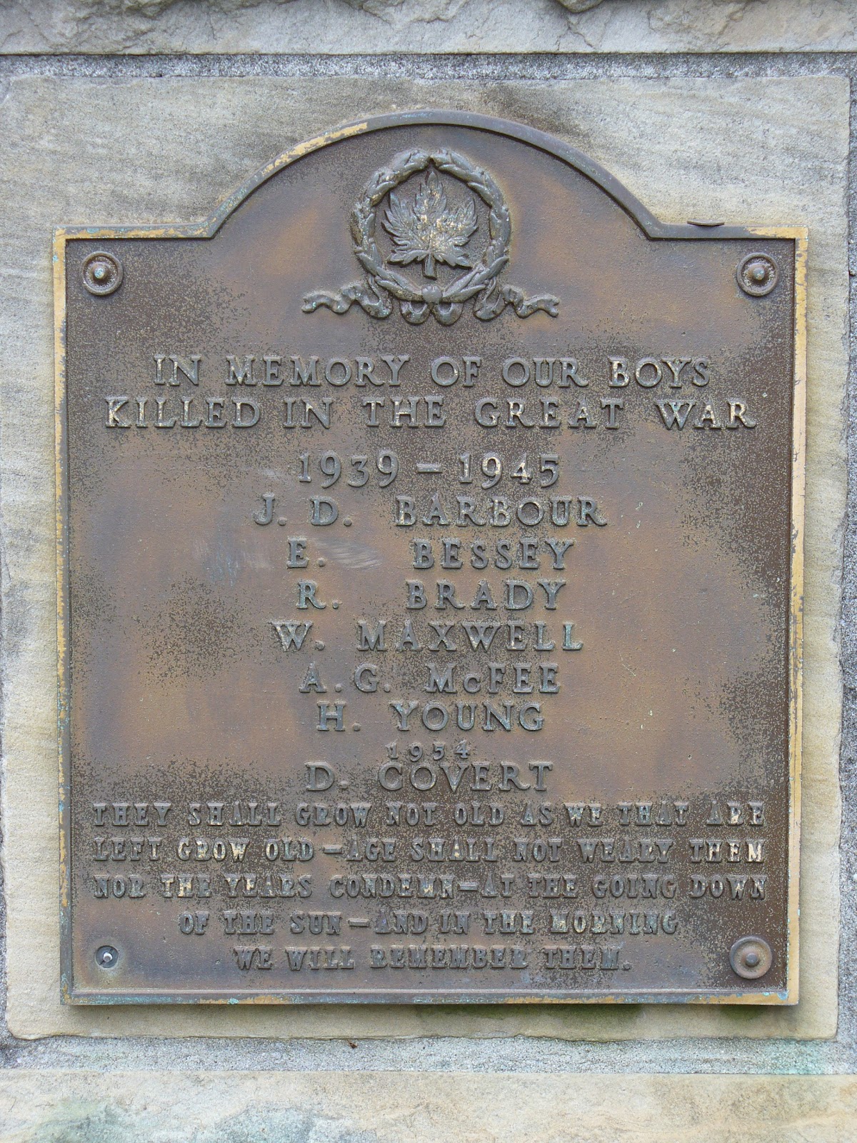 Ce monument commémoratif a été dédié le 11 novembre 1956 à la mémoire des anciens combattants et des hommes de la région morts au combat au cours de la Première et de la Seconde Guerre mondiale. Des plaques ont par la suite été ajoutées pour reconnaître la guerre de Corée, les opérations d’après-guerre et la mission en Afghanistan. Il a été érigé par la filiale 442 de la Légion royale canadienne. Il s’agit d’une construction trilatérale unique de pierre et de brique, avec un côté réservé à chaque conflit important du 20e siècle.