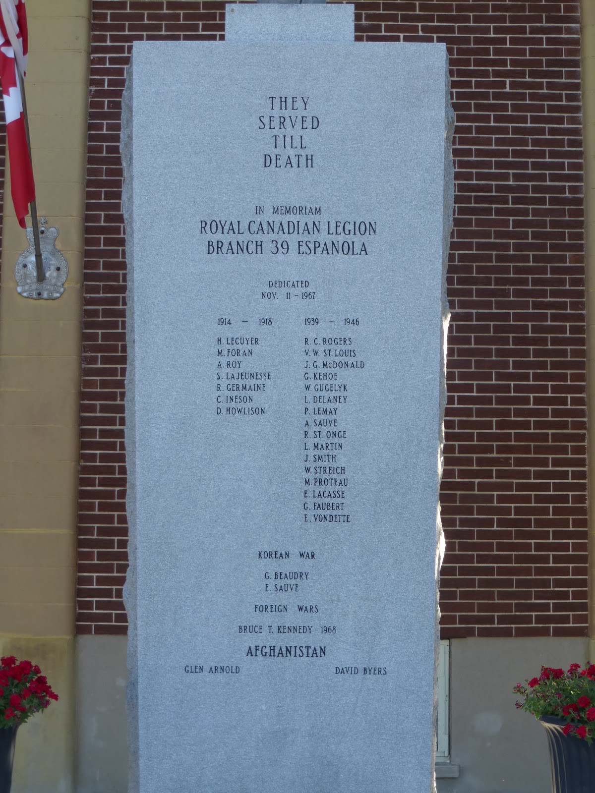 Ce mémorial est dédié aux soldats disparus des Première et Seconde Guerres mondiales, de la guerre de Corée et de la guerre du Vietnam. Il a été inauguré le 11 novembre 1967, dans un endroit central situé près des écoles (parc de la rue Mead), et déplacé ensuite sur le terrain de la salle de Légion vers 1982. Le maire de l’époque, Leo Foucault (un ancien combattant), a joué un rôle clé dans l’achat et l’inauguration du monument. Tous les noms inscrits sont ceux de citoyens de l’endroit. Les cérémonies du jour du Souvenir ont lieu à la salle de la Légion, autour du cénotaphe.
